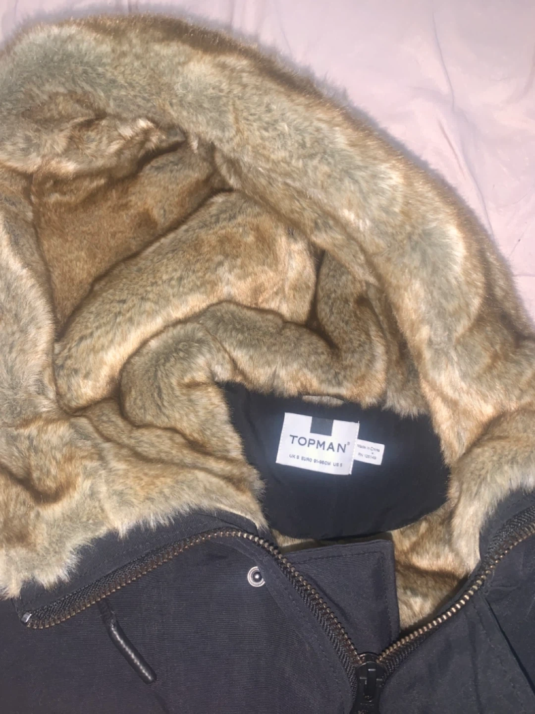 Topman black parka jacket featuring a fur-lined hood. Made with a durable outer shell and lined for warmth. Includes multiple pocket details and a zip and button closure.