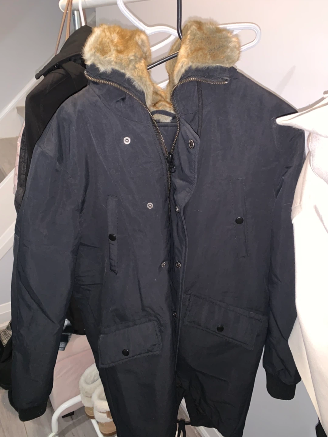 Topman black parka jacket featuring a fur-lined hood. Made with a durable outer shell and lined for warmth. Includes multiple pocket details and a zip and button closure.