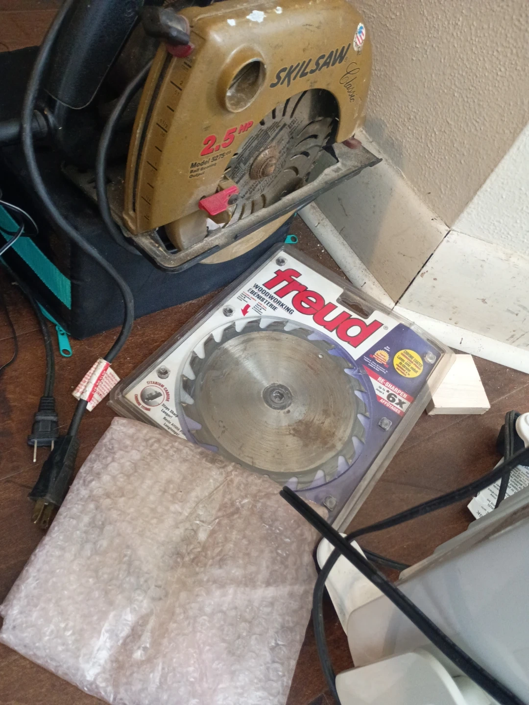 SkilSaw Classic 2.5 HP circular saw, model 5275-05. Includes a Freud woodworking saw blade with titanium carbide and chrome coating, designed for re-sharpening up to 6 times. This tool is useful for woodworking projects. The saw has a ball bearing output. Comes with extra blade and manual