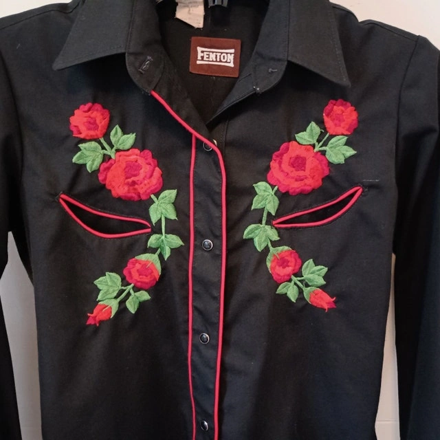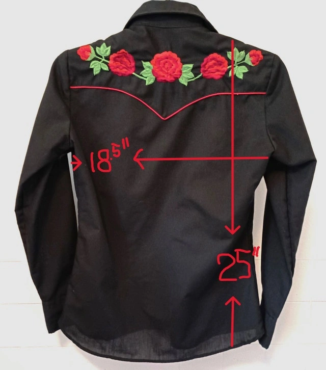 Fits women's Small / Medium.(please see measurements in photo). Tagged size 10/32. 65% polyester 35% cotton. Great vintage condition. Smile pockets with cuffs, back yoke and centre front placket trimmed with red corded piping. Black pearl snaps. Carefully washed and ready to wear. No shipping. Available at safe, public meet up in downtown Kitchener.