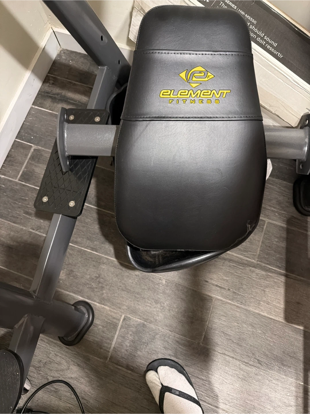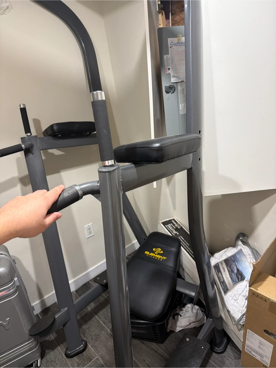 Element Fitness vertical knee raise station for home workouts. It's black with grey metal accents. Includes hardware bag and some replacement parts. Comes with receipt msrp $676.00 from the treadmill factory, barely used.