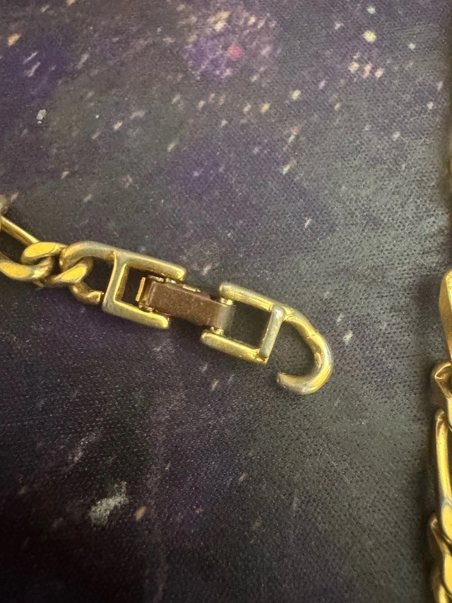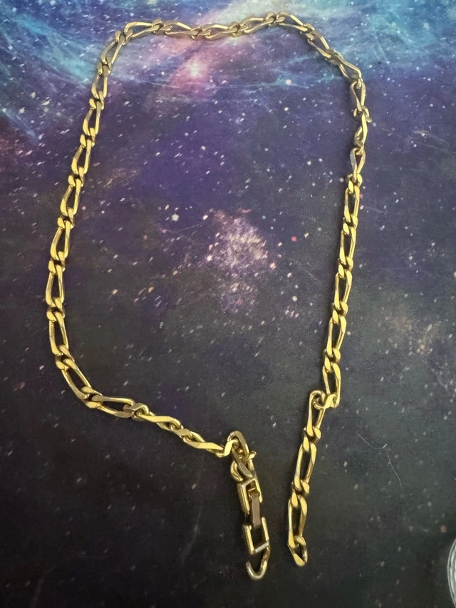 This is a gold chain, but unfortunately the clasp is broken, as can be seen in the photos. Maybe you're good at fixing jewelry, or perhaps you know someone who is! If this ad is still up, you can be sure the chain is available!