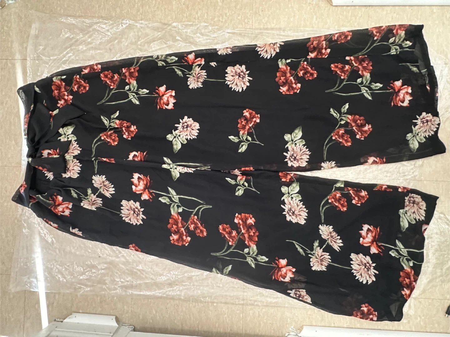 Selling a pair of Tanya Taylor wide leg pants in size L. They feature a beautiful floral pattern on a black background. Perfect for a stylish and comfortable look!