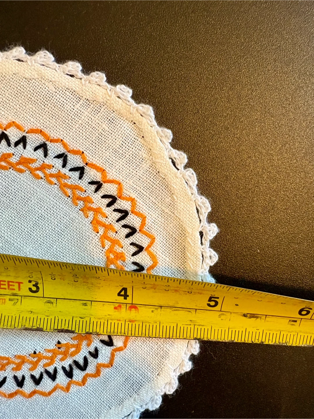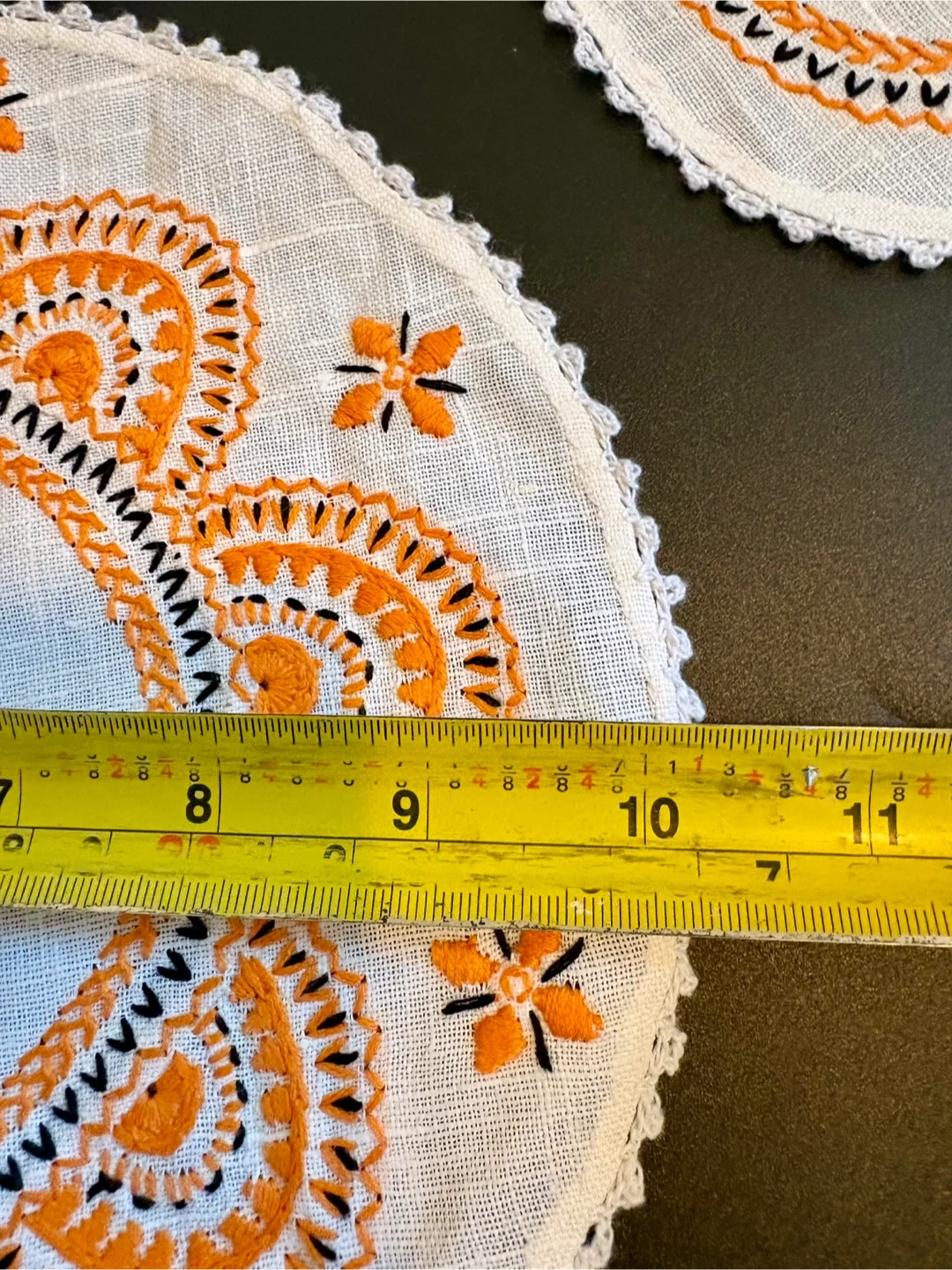 This set includes one circular table runner and six round coasters. All pieces feature white linen-like fabric with orange and black embroidered detailing and a crocheted edge. The runner measures approximately 10.5 inches in diameter. Coasters are about 4 inches in diameter. They're perfect for protecting surfaces from drinks!