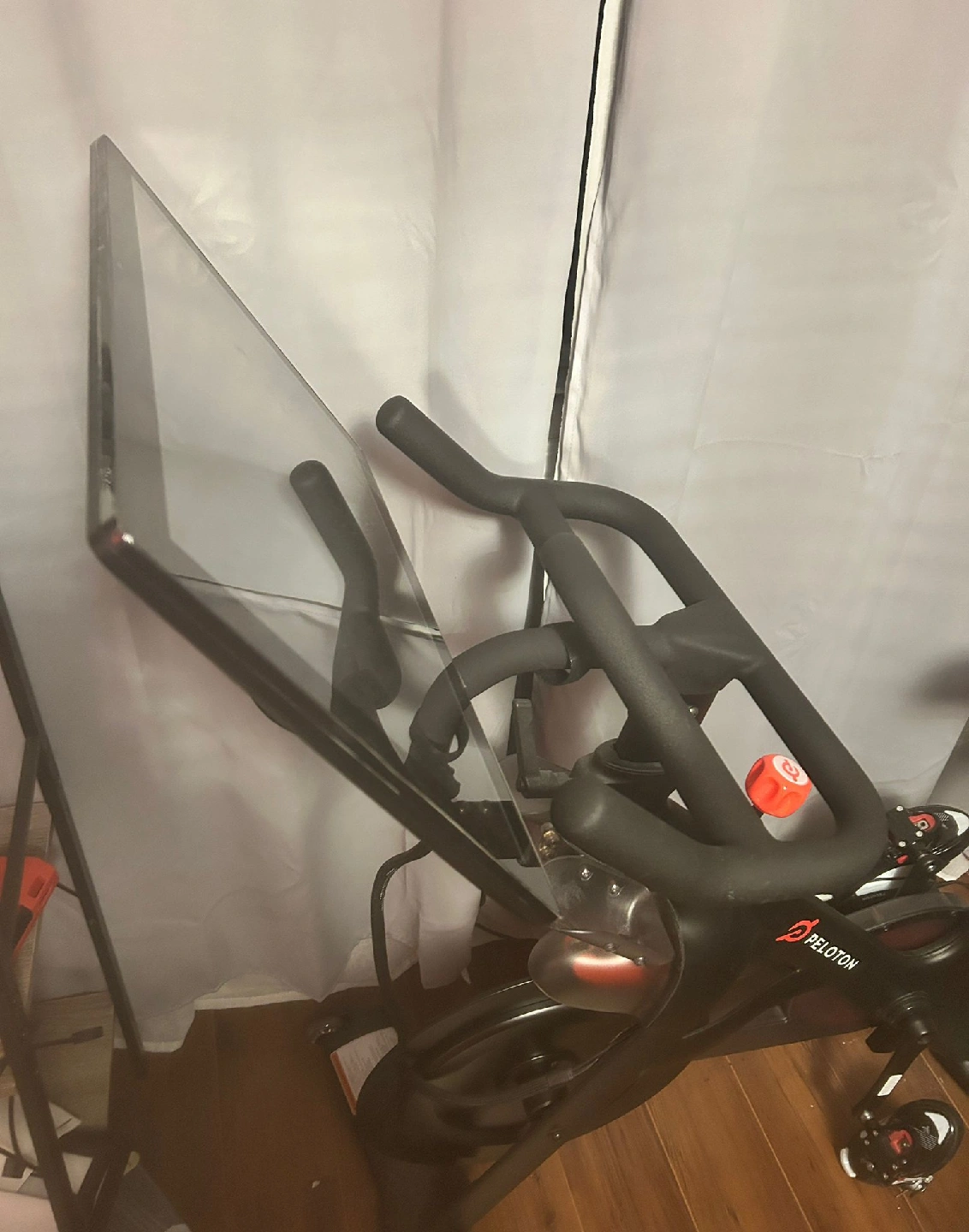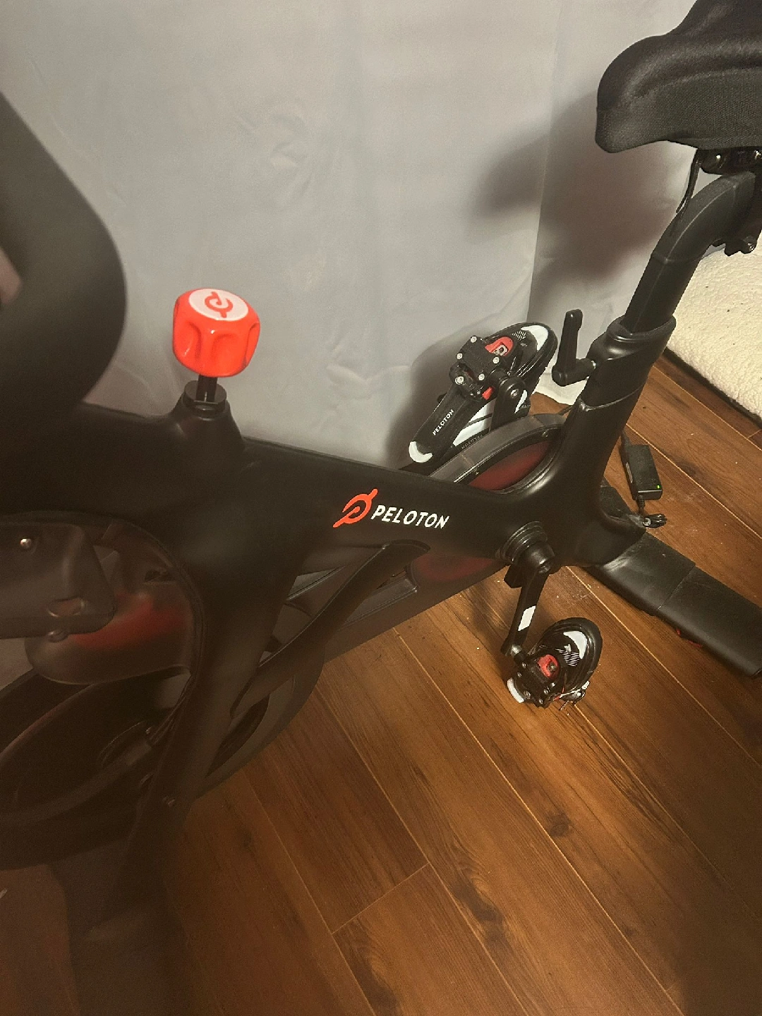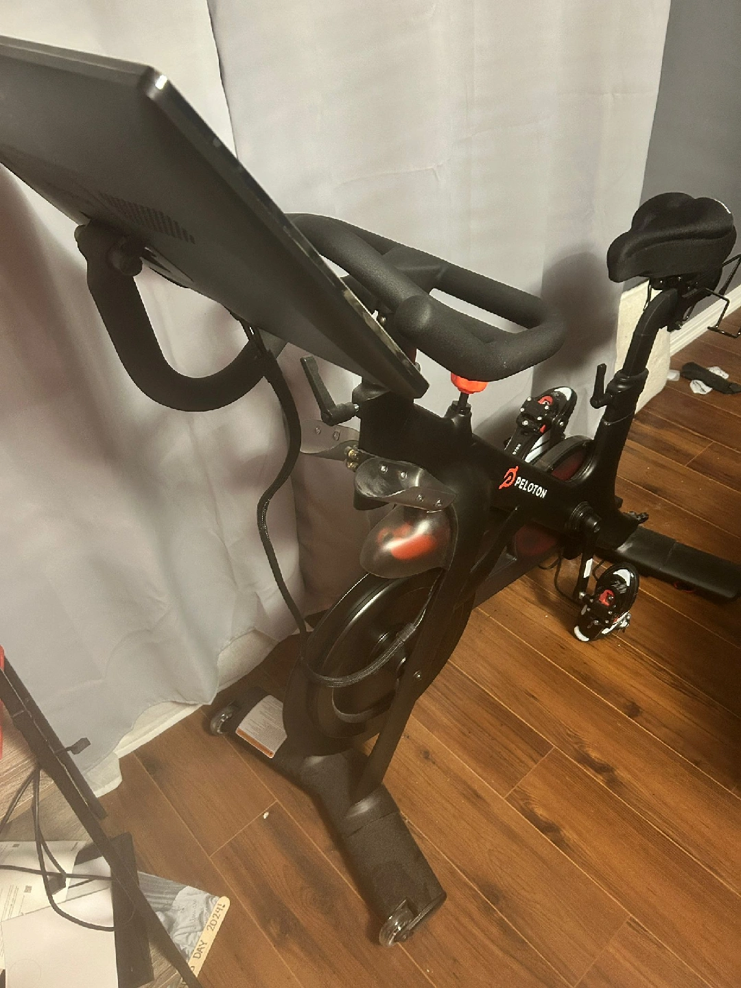 Peleton Bike Purchased in 2021 Barely used. Like new condition. Comes with two 2lb dumbbells and two pairs of shoes (Men's size 10 and Women's size 6).