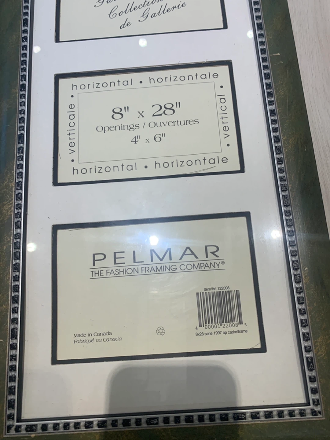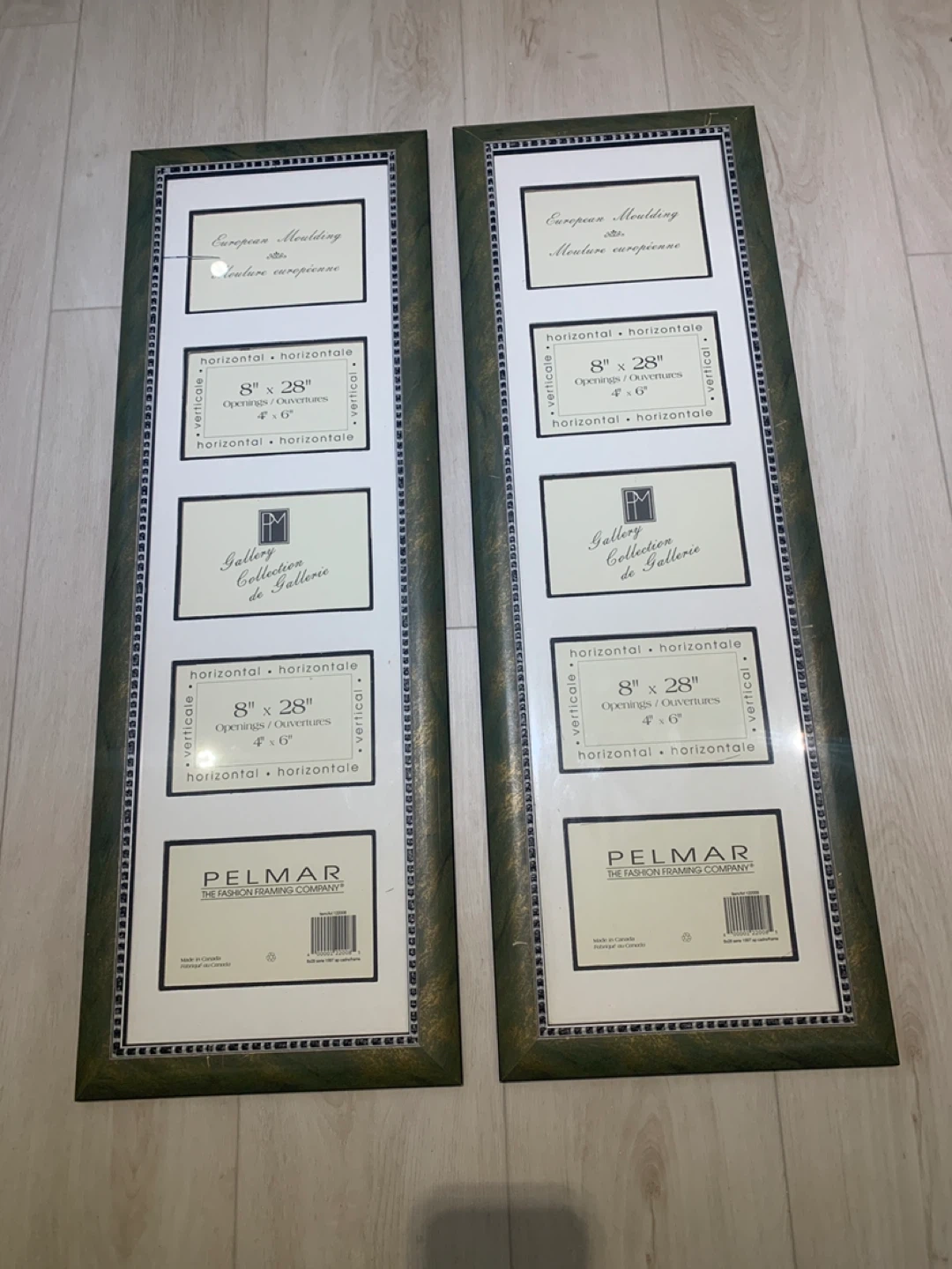 Selling a collage picture frame by Pelmar, The Fashion Framing Company. It's designed to hold multiple photos in a single frame. The frame has openings for 4" x 6" pictures within an 8" x 28" space. Made in Canada Each $15 Both for $25
