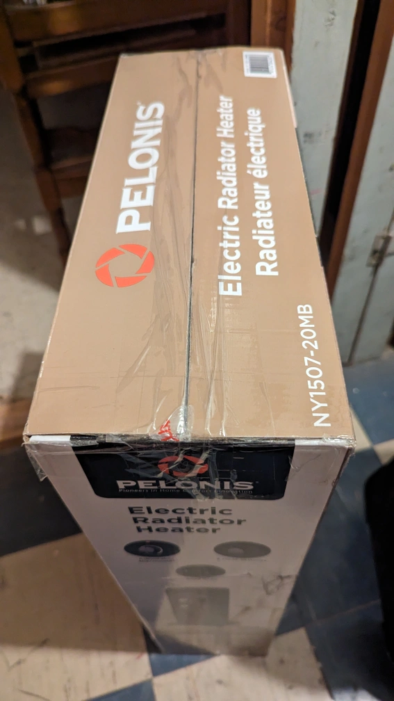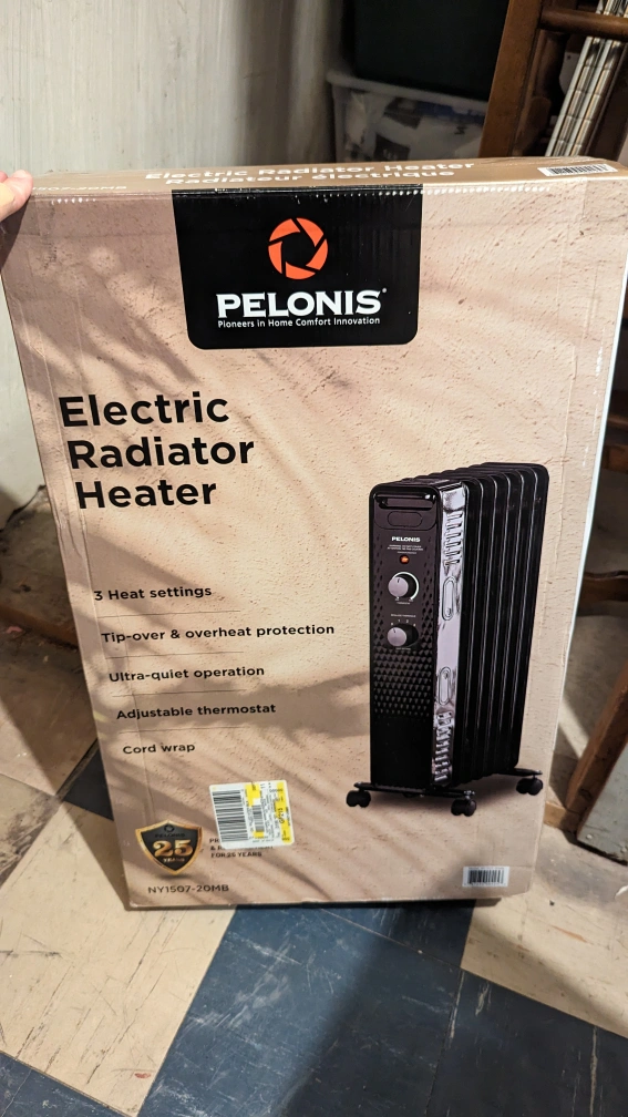 This is a Pelonis electric radiator heater. It has 3 heat settings, tip-over and overheat protection, an adjustable thermostat, and a cord wrap. It's ultra quiet. Used for 2 weeks at a cottage last winter. Like new. Pick up only.