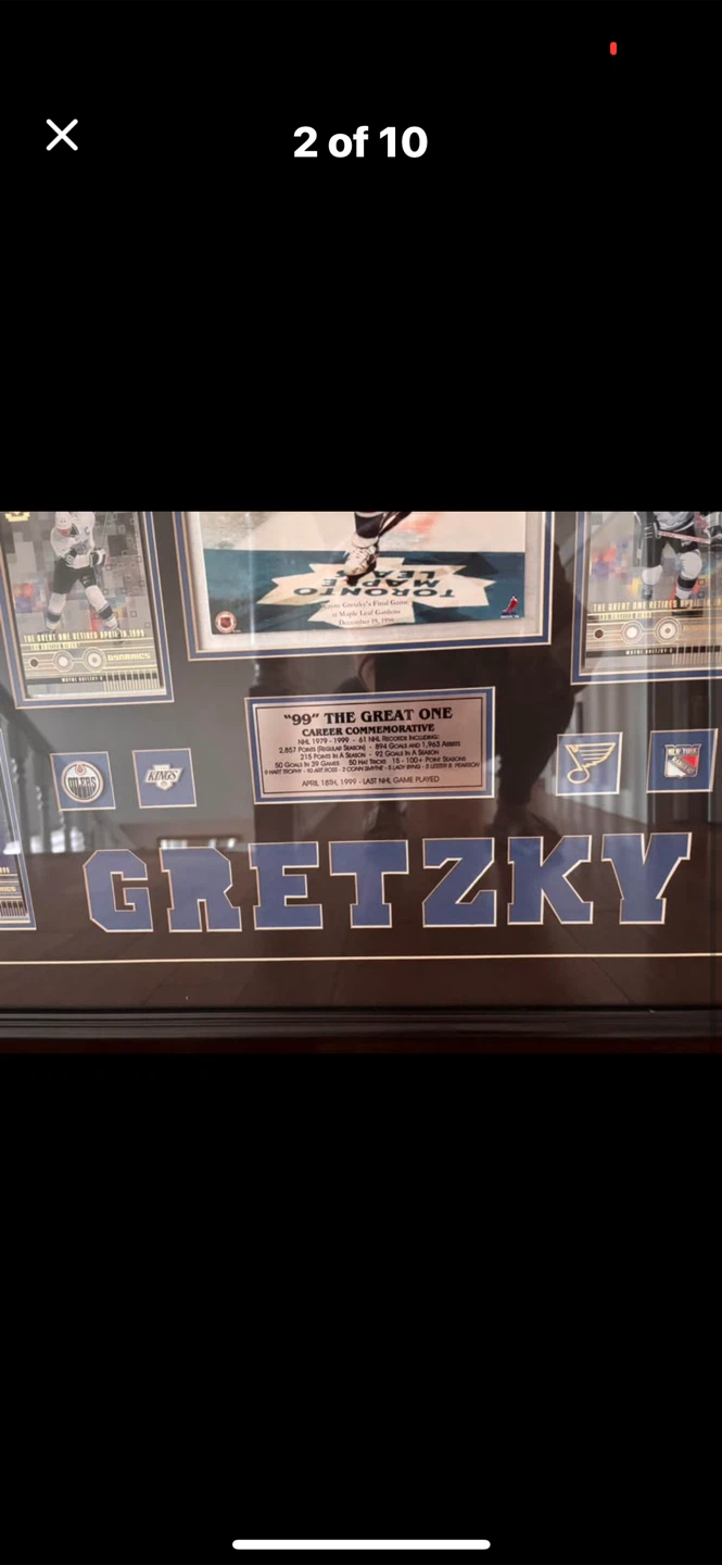 Large, approx. 33"x37" professionally framed Wayne Gretzky career commemorative featuring multiple licensed cards and a central 8x10 photo of his final game..includes Gretzky cards with Oilers, Kings, Blues & Rangers..also includes teams collecter pins..