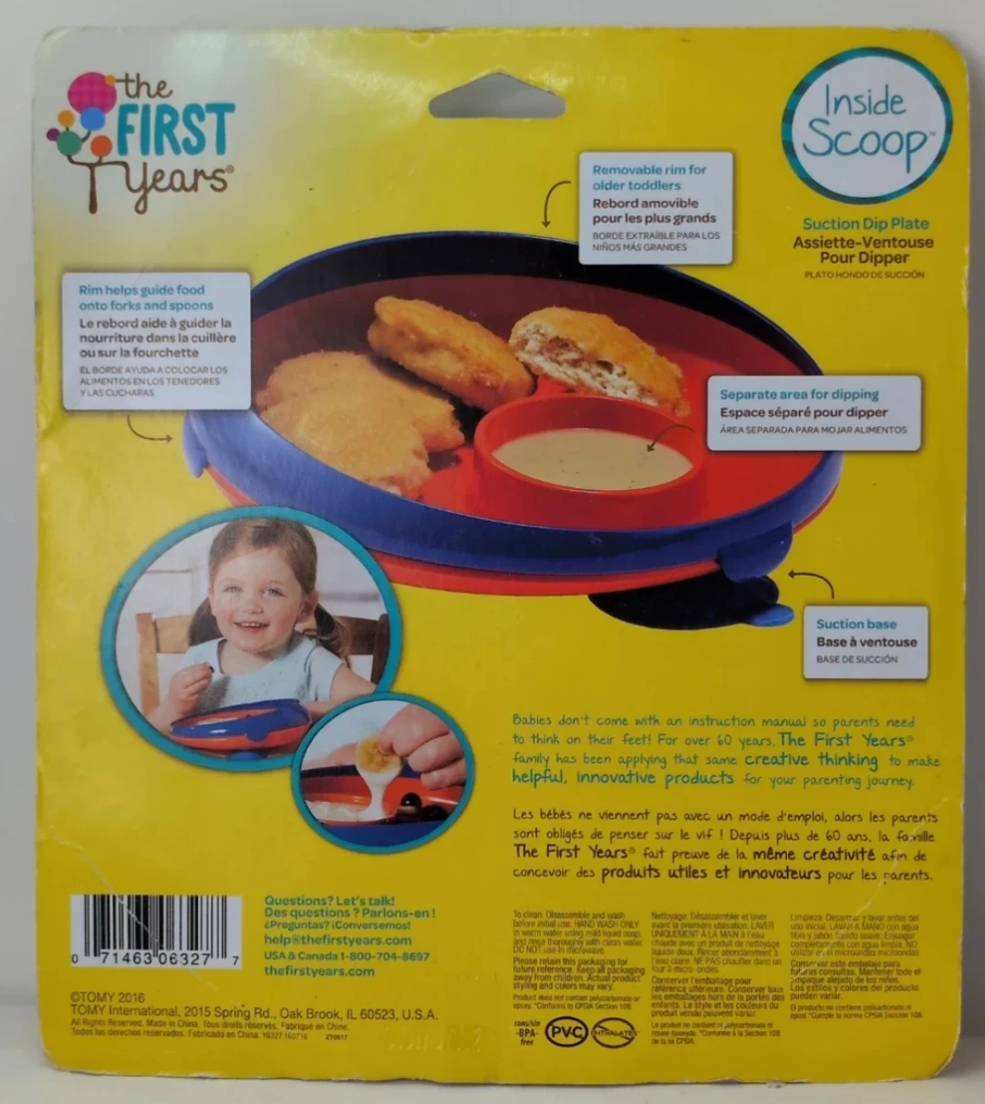 This plate features a built-in dipping area and a removable rim for less mess. It has a suction base to prevent spills and separate sections for food. Perfect for babies 12 months and older!