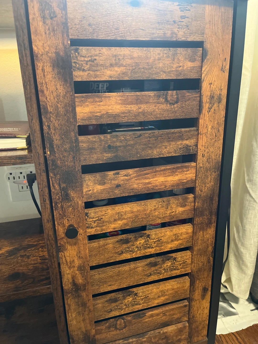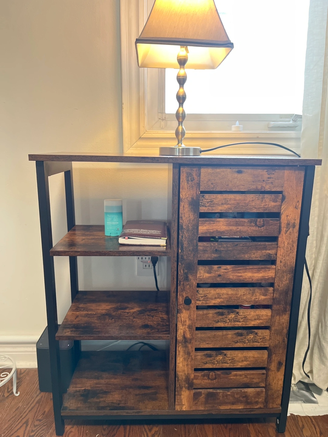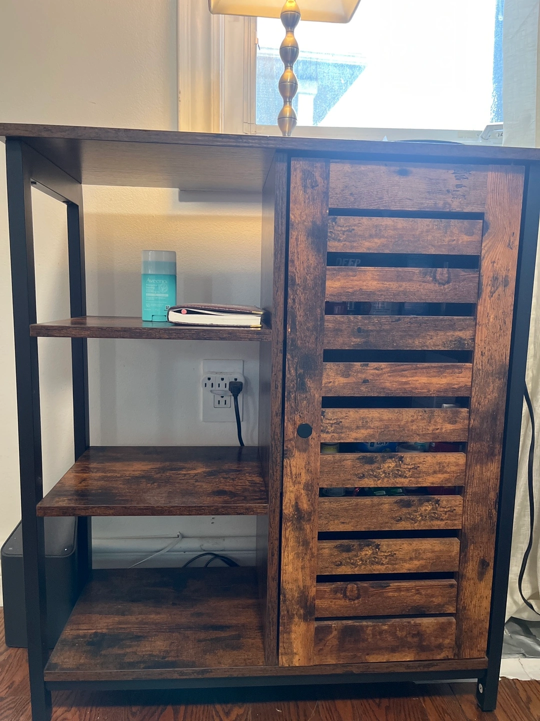 Cabinet with one door and two shelves. The cabinet door has a slatted design and the shelves are open. The cabinet has a rustic, brown finish and black metal accents.In great shape bought for $125 .