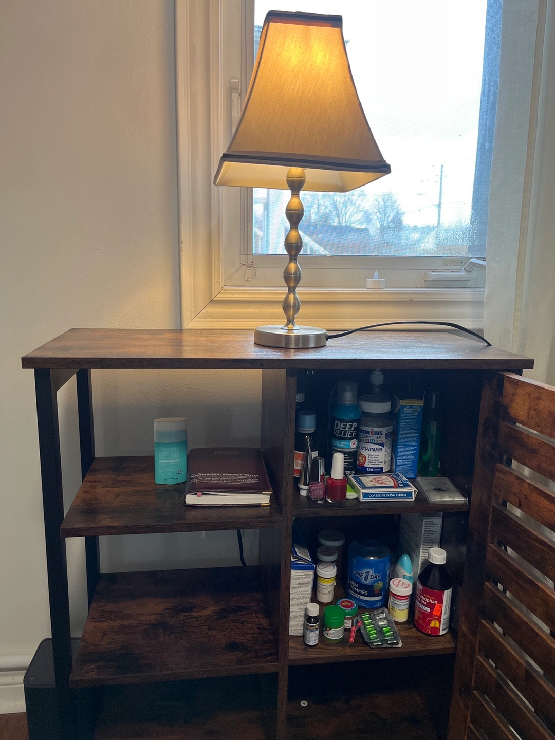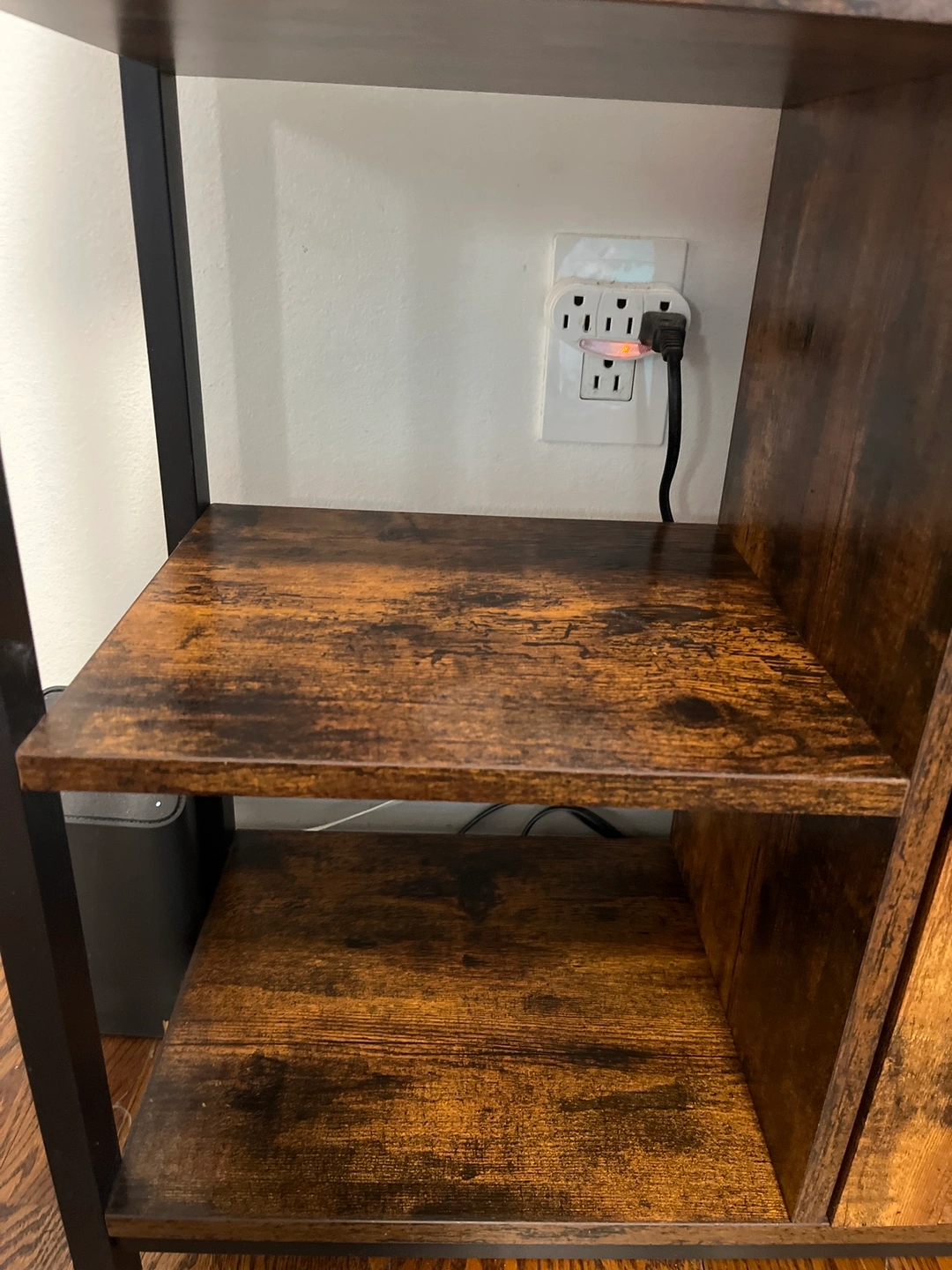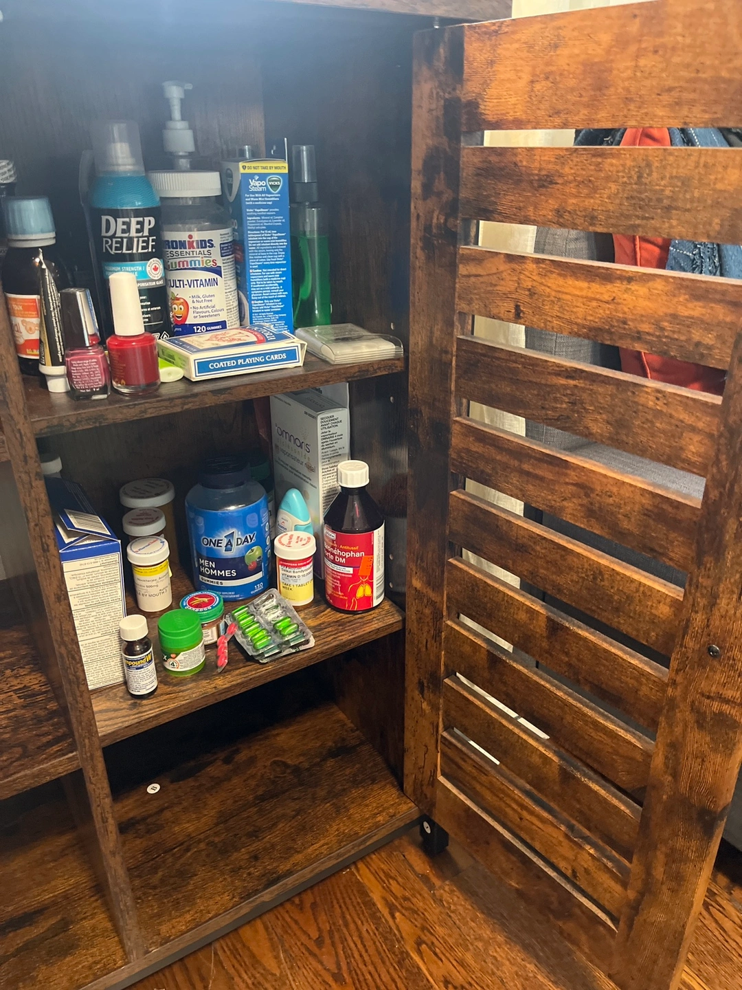 Cabinet with one door and two shelves. The cabinet door has a slatted design and the shelves are open. The cabinet has a rustic, brown finish and black metal accents.In great shape bought for $125 .
