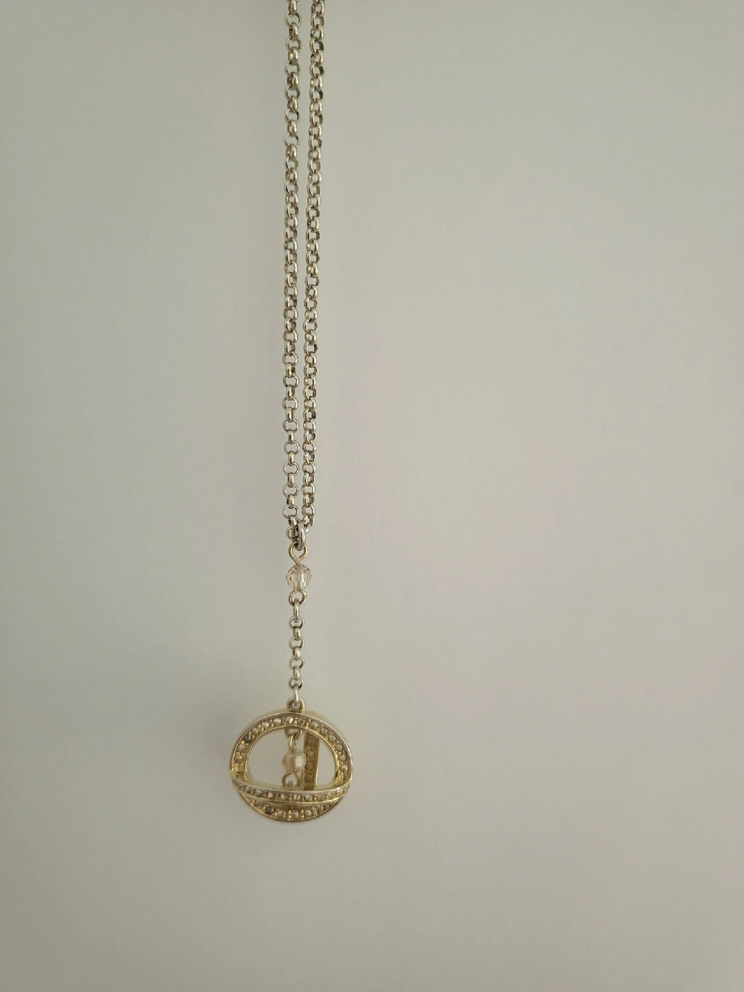 10Selling a pendant necklace. It has a silver-coloured chain and a gold-coloured pendant. It's in great condition!