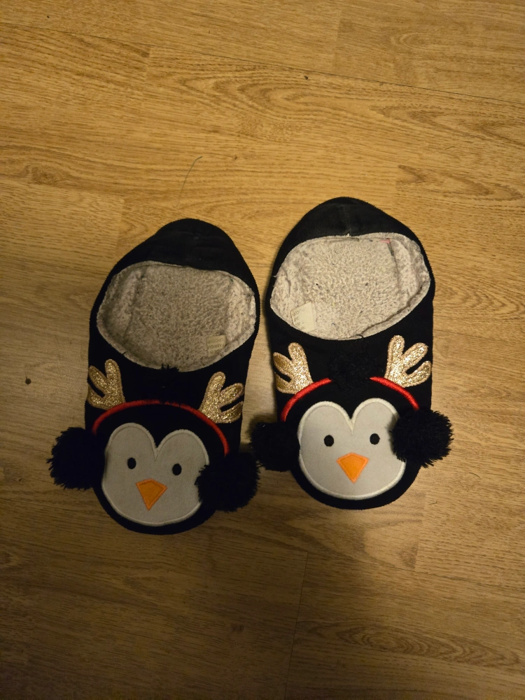 698Super cute penguin slippers! These cozy slippers feature a fun penguin design with earmuffs and antlers. Perfect for keeping your feet warm and comfy around the house