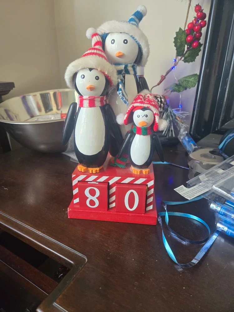 60This charming wooden perpetual calendar features an adorable family of penguins! The calendar uses number blocks to display the date, making it a fun and festive addition to your home decor during the holidays or any time of year