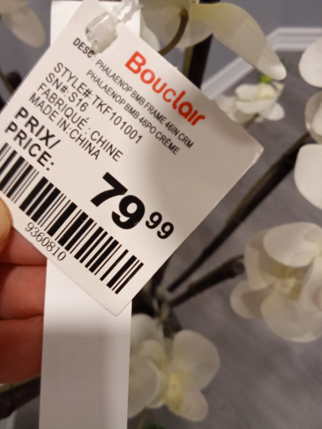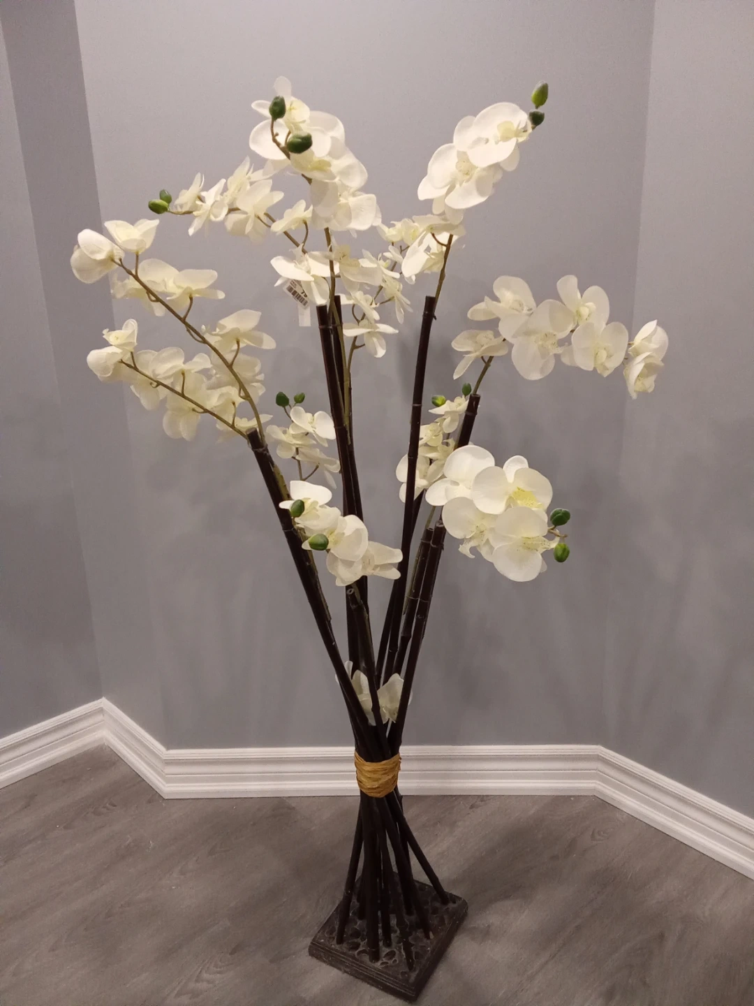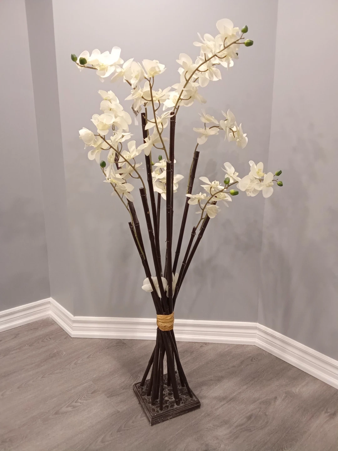 This Bouclair decorative floral arrangement features white orchids on dark bamboo stems. It's tied with twine and set in a square base. Adds a touch of elegance to any room!