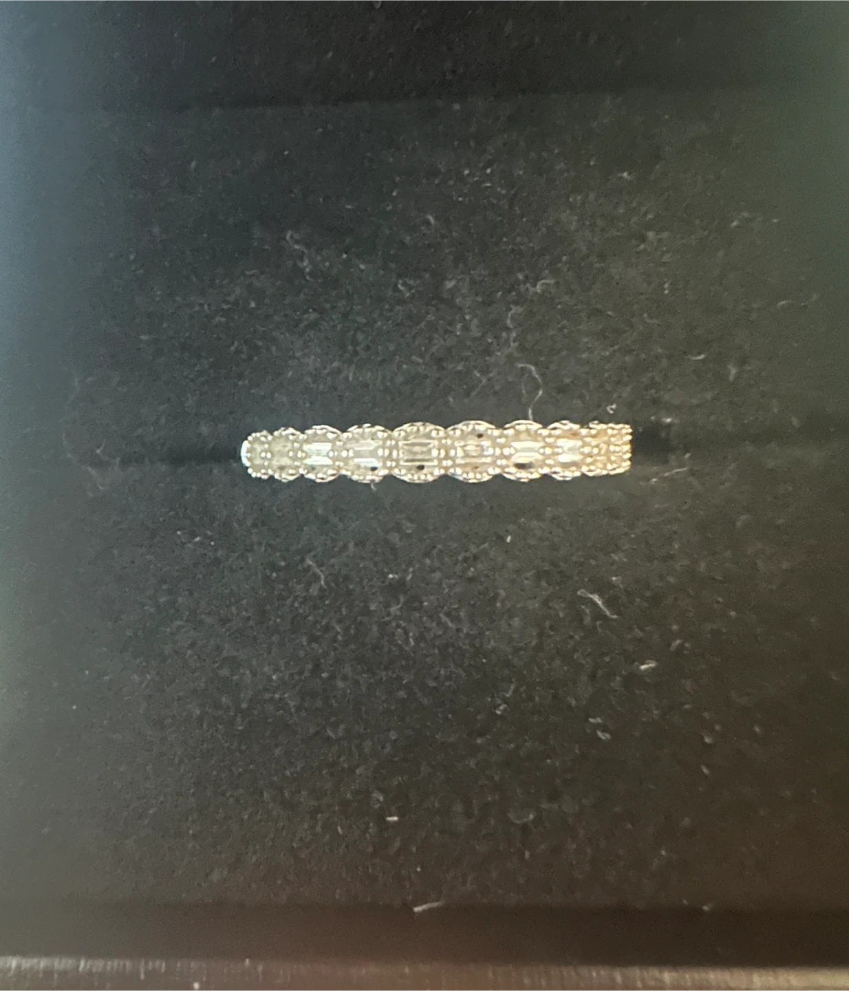 60- Willing to negotiate - Bought as a promise ring - Selling a beautiful diamond scallop edge vintage-style stackable anniversary band in 10K white gold. It features 0.065 CT. T.W. baguette diamonds. Originally bought for $339.00