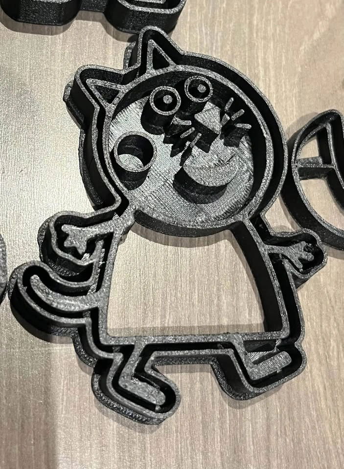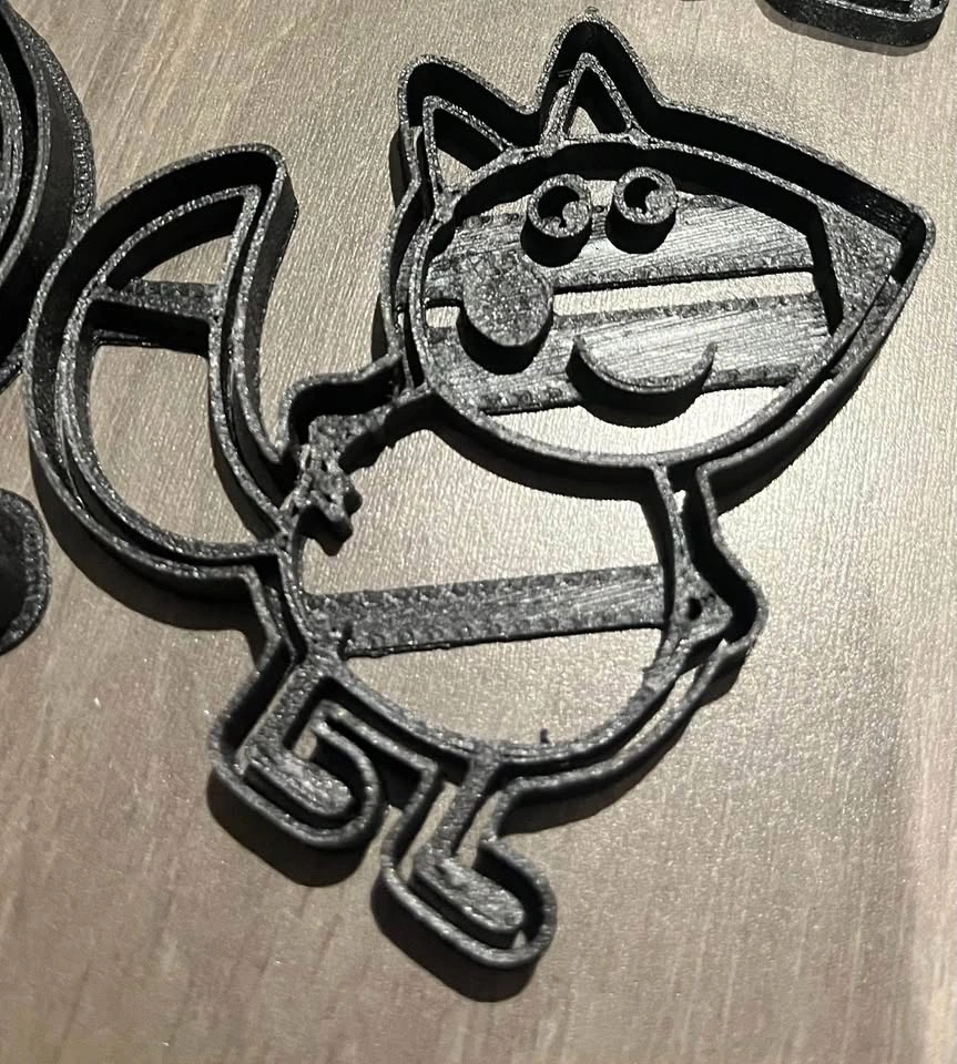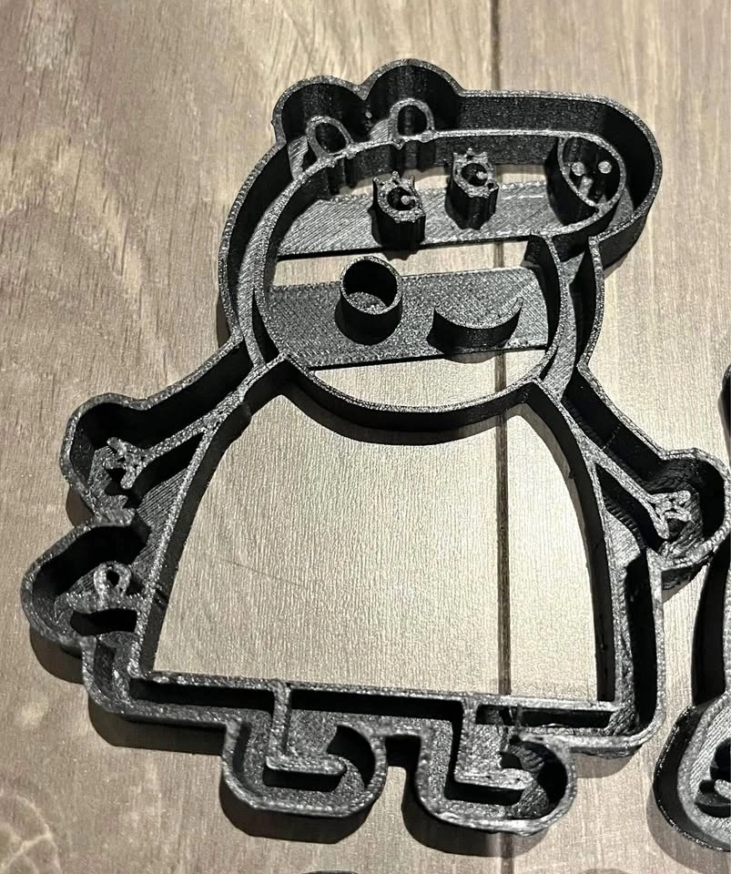 76$25 for all 6 or $5 each. Mummy pig, daddy pig, miss rabbit , peppa pig, candy cat, greedy fox. Simple easy cookie cutters- just stamp and done!