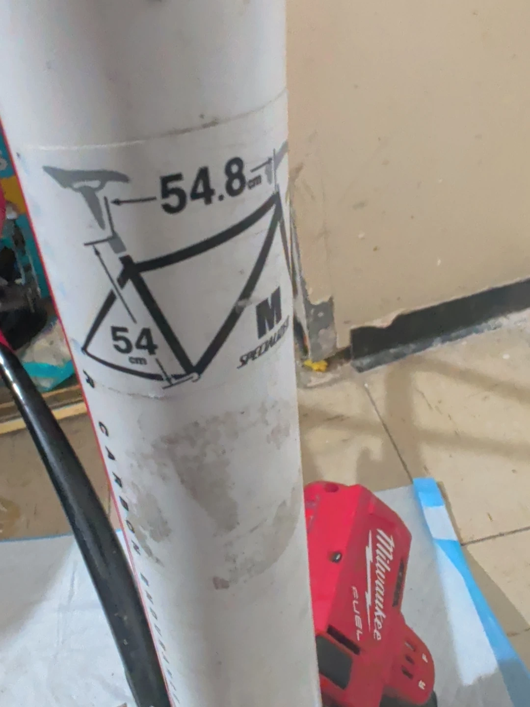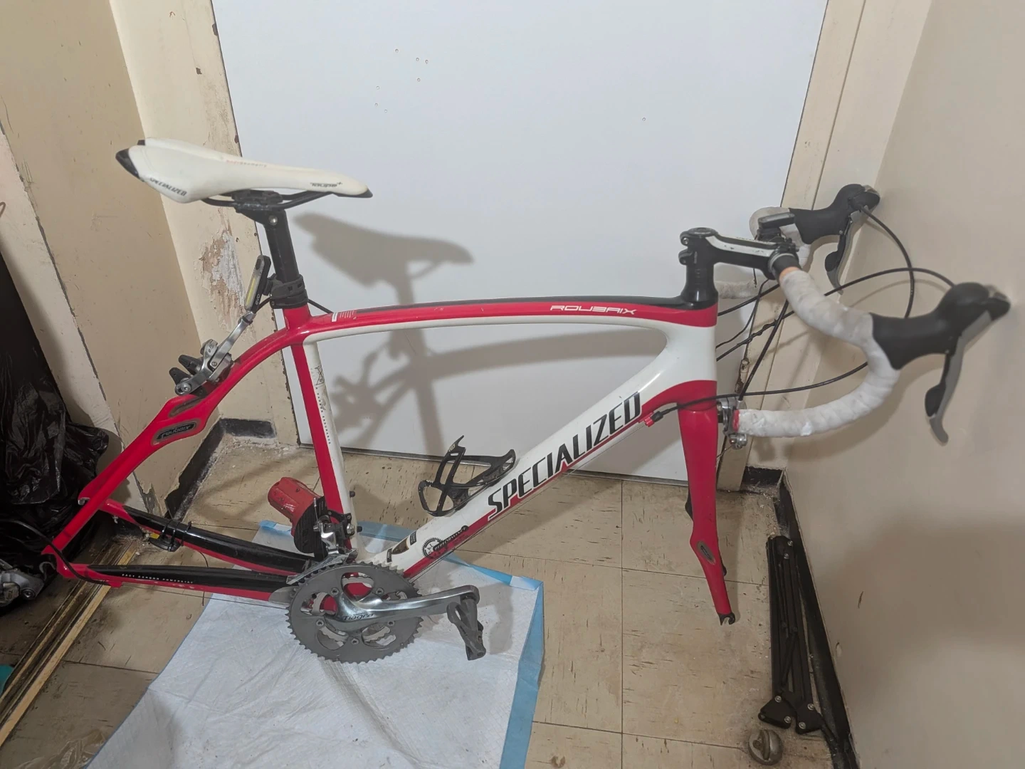 Specialized Roubaix carbon road bike frame. Size 54cm. Comes with a Specialized saddle and handlebars with tape. Includes a bicycle computer.