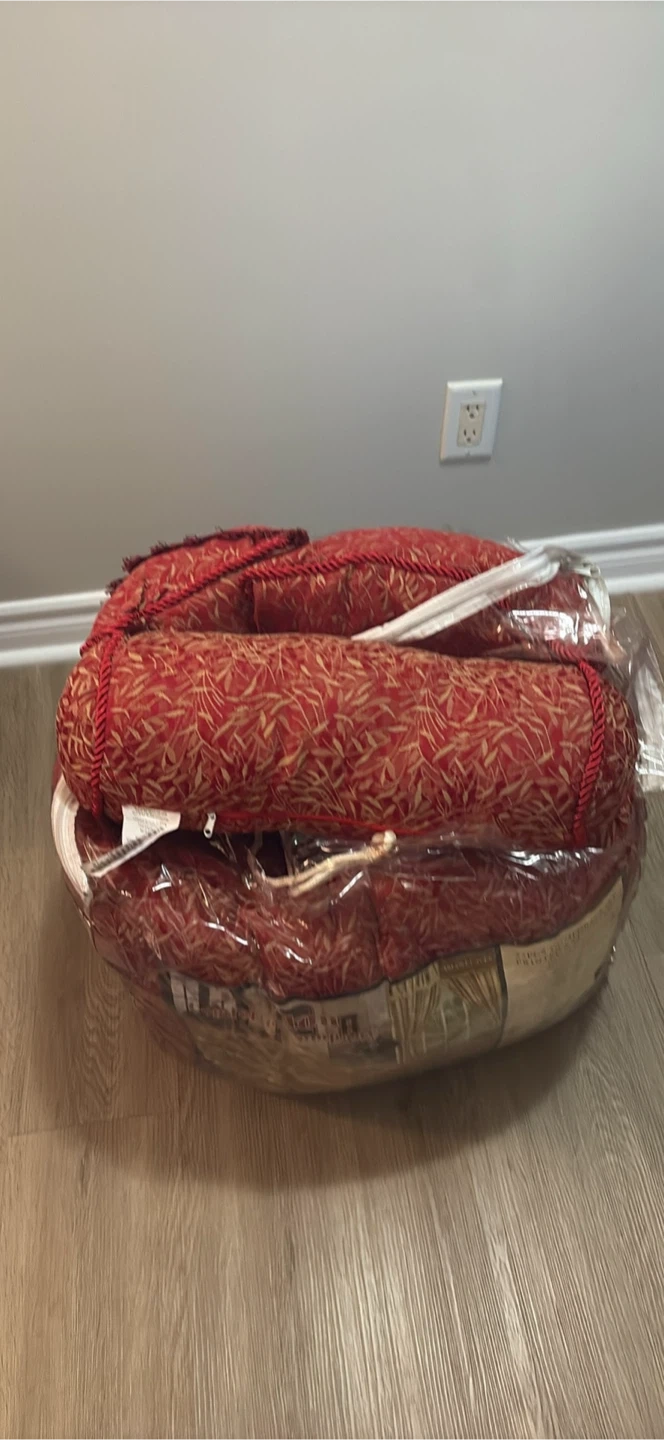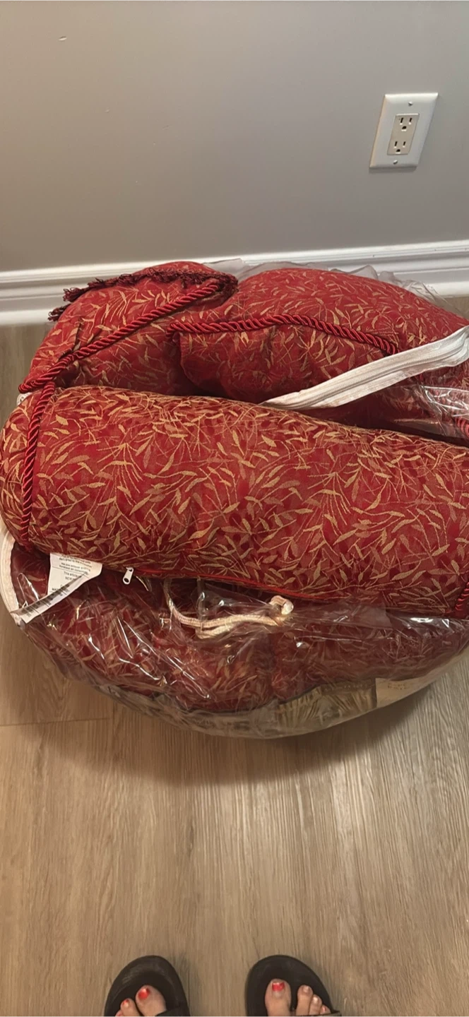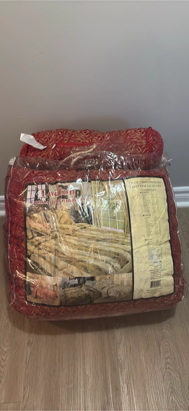 It's a 5-piece comforter set featuring a red and gold leaf pattern. Includes two decorative pillows, one square and one bolster. Fabric is likely polyester blend.