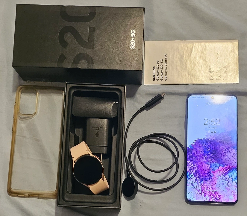 (FIRM PRICE) Samsung s20 plus color black 128 gb 5g sd more memory can be added with a sd card unlocked for any phone service no scratches or cracks screen protector on it also galaxy watch 4 40mm rose gold also included a wireless fast charger dock will meet up In a phone store if needed or if local can bring it