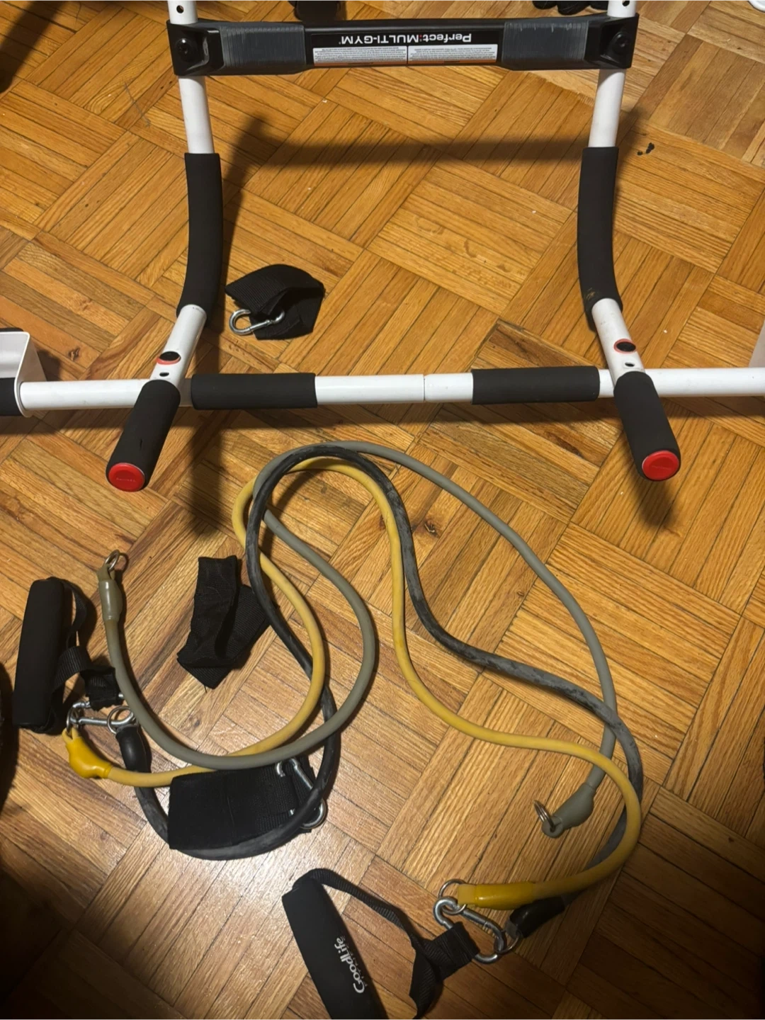 55Selling a Perfect Multi-Gym pull up bar. It comes with resistance bands and other components as pictured. Great for a home workout!