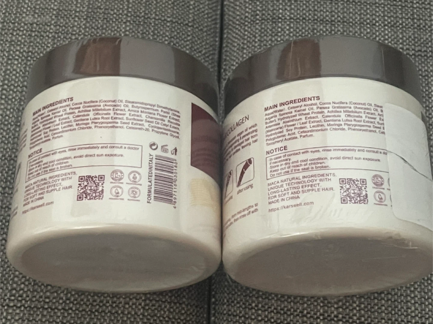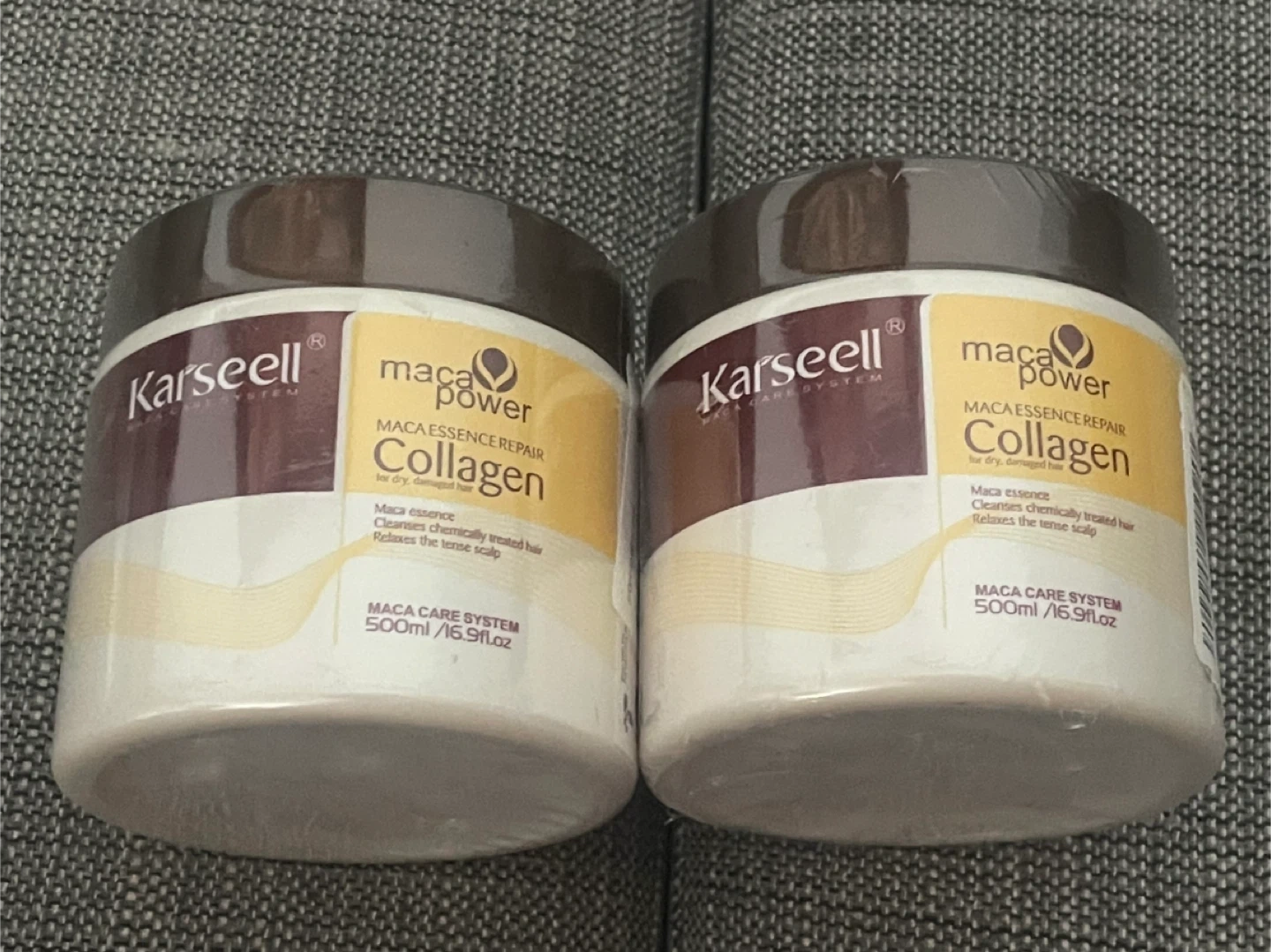 This is a 2-pack of Karseell Maca Essence Repair Collagen hair mask. Each jar is 500ml/16.9fl.oz. It's designed for dry, damaged hair. The mask penetrates chemically treated hair and relaxes the scalp.