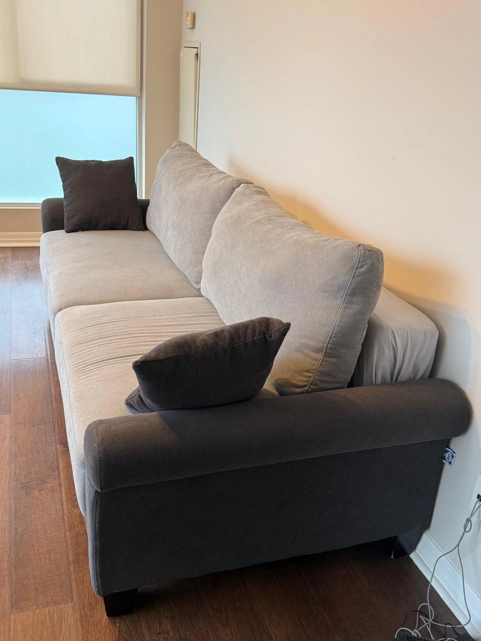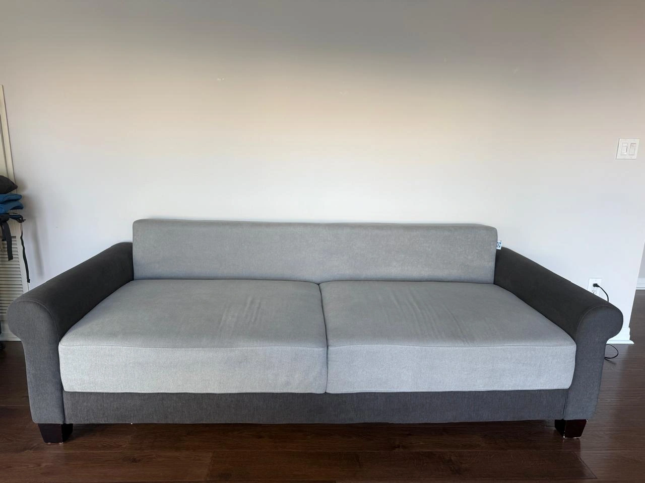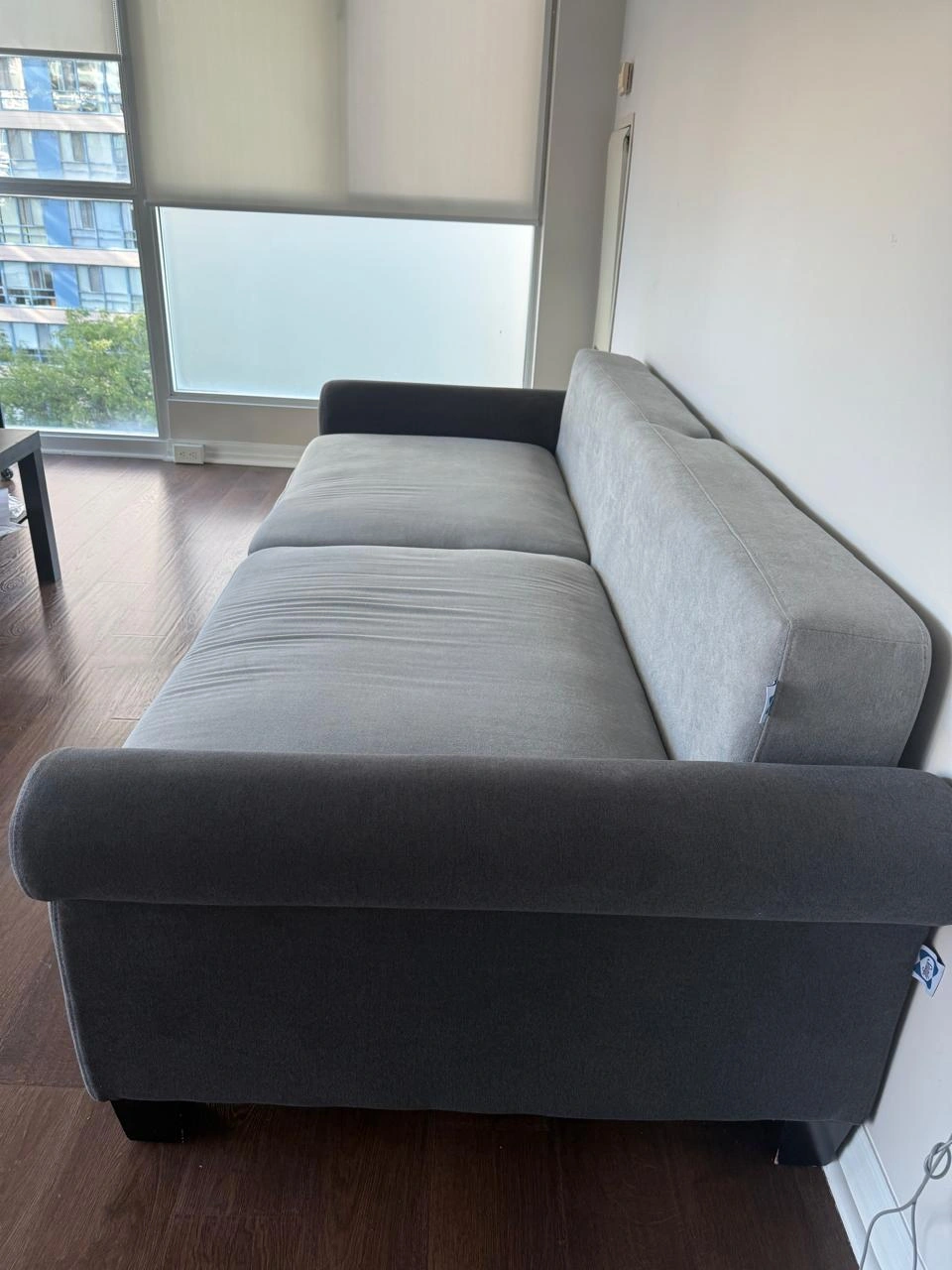 Selling a comfy grey sofa! It's in great shape and would be perfect for a living room or den. Pillows are included. Bed - 250 includes bed frame and bed box with mattress. Sofa - 300 it is sofa cum bed. IKEA coffee table - 20 ***sold Bed side table - 20 ***sold IKEA standing mirror - 30