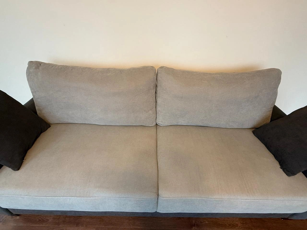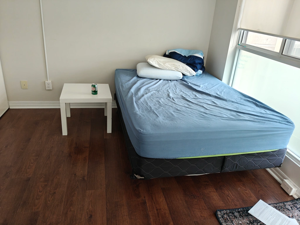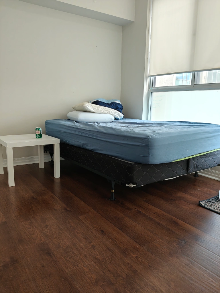 Selling a comfy grey sofa! It's in great shape and would be perfect for a living room or den. Pillows are included. Bed - 250 includes bed frame and bed box with mattress. Sofa - 300 it is sofa cum bed. IKEA coffee table - 20 ***sold Bed side table - 20 ***sold IKEA standing mirror - 30