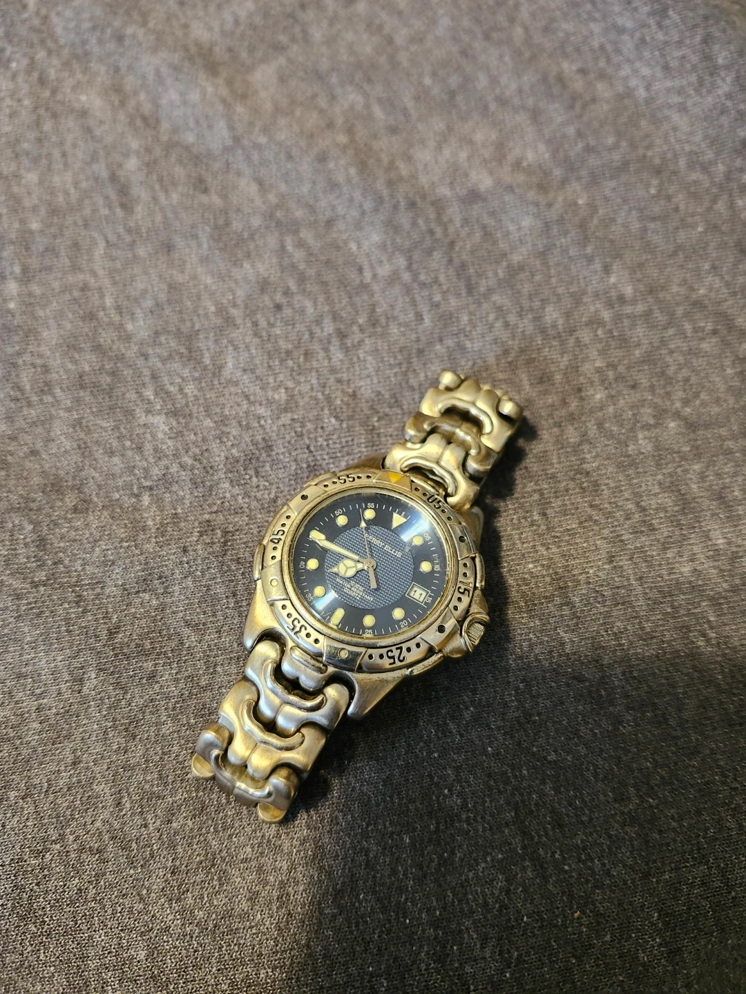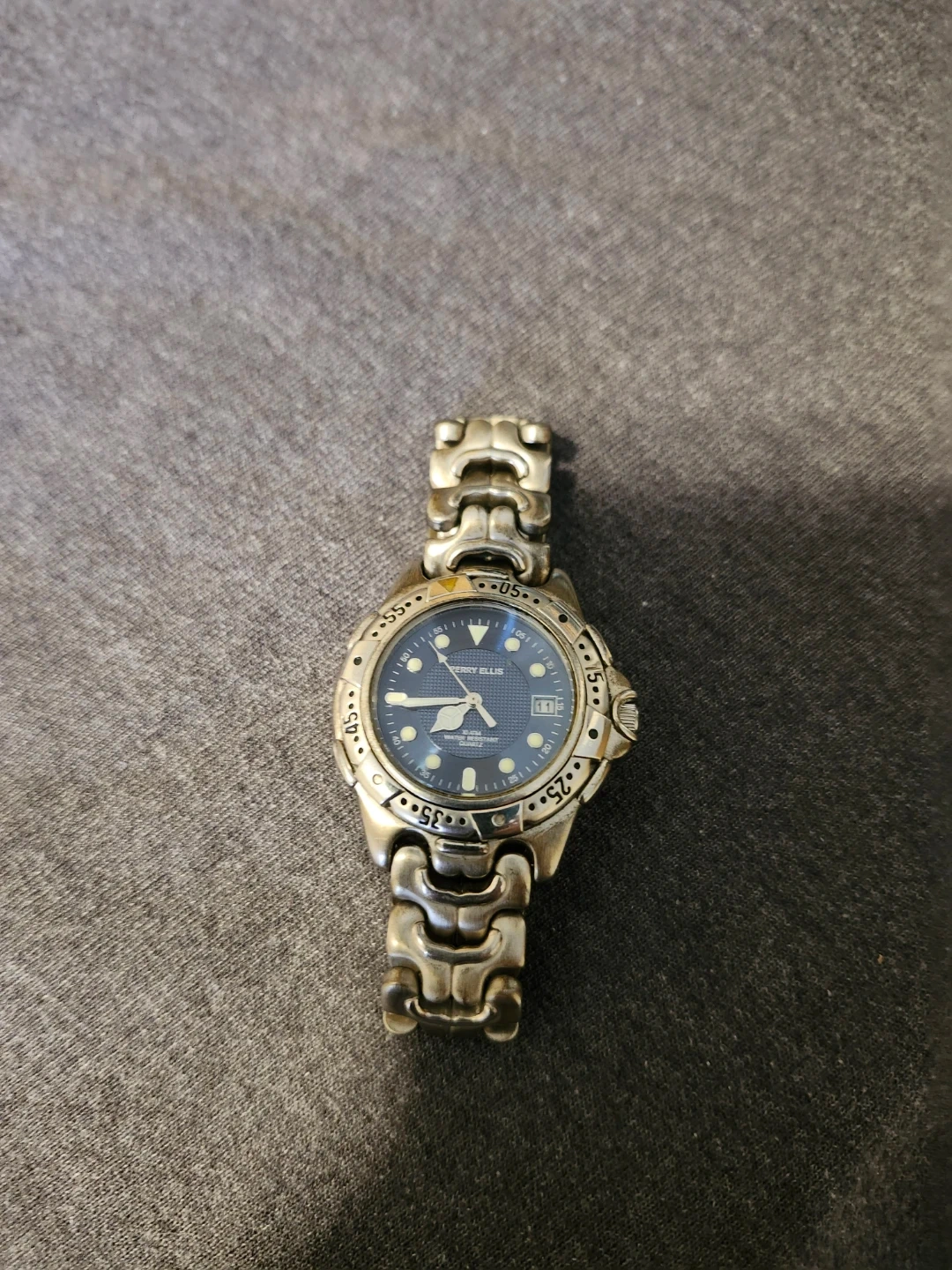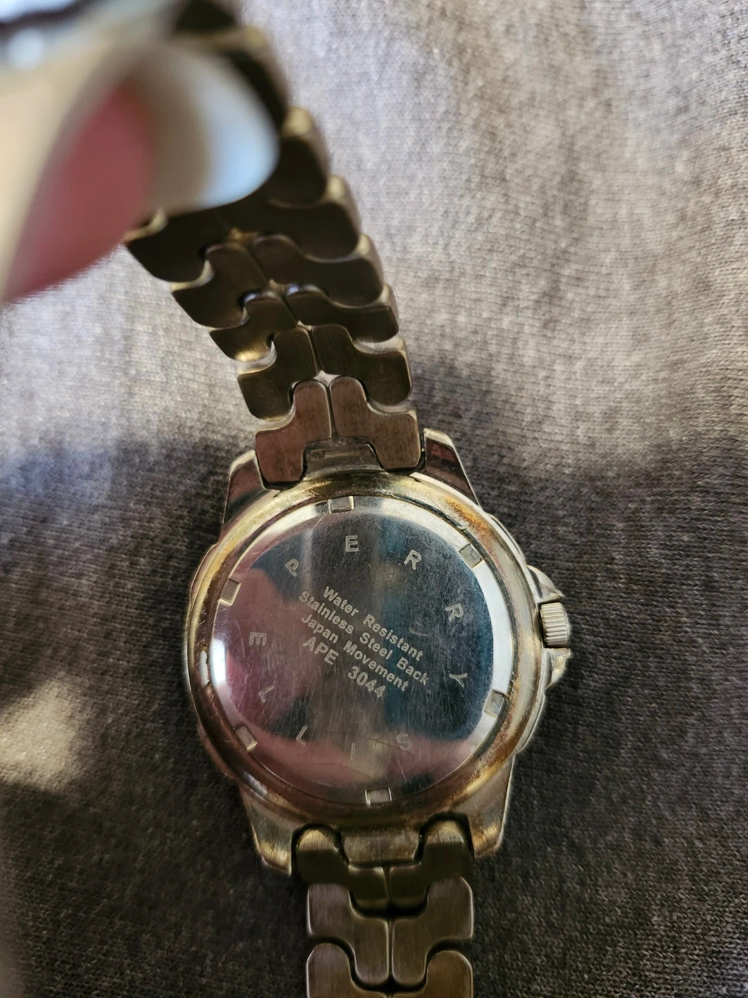 37Selling a Perry Ellis ladies watch! It's water-resistant with a stainless steel back and a Japan movement. The model number is APE 3044. It has a blue face and silver band. In great condition just needs a new battery!