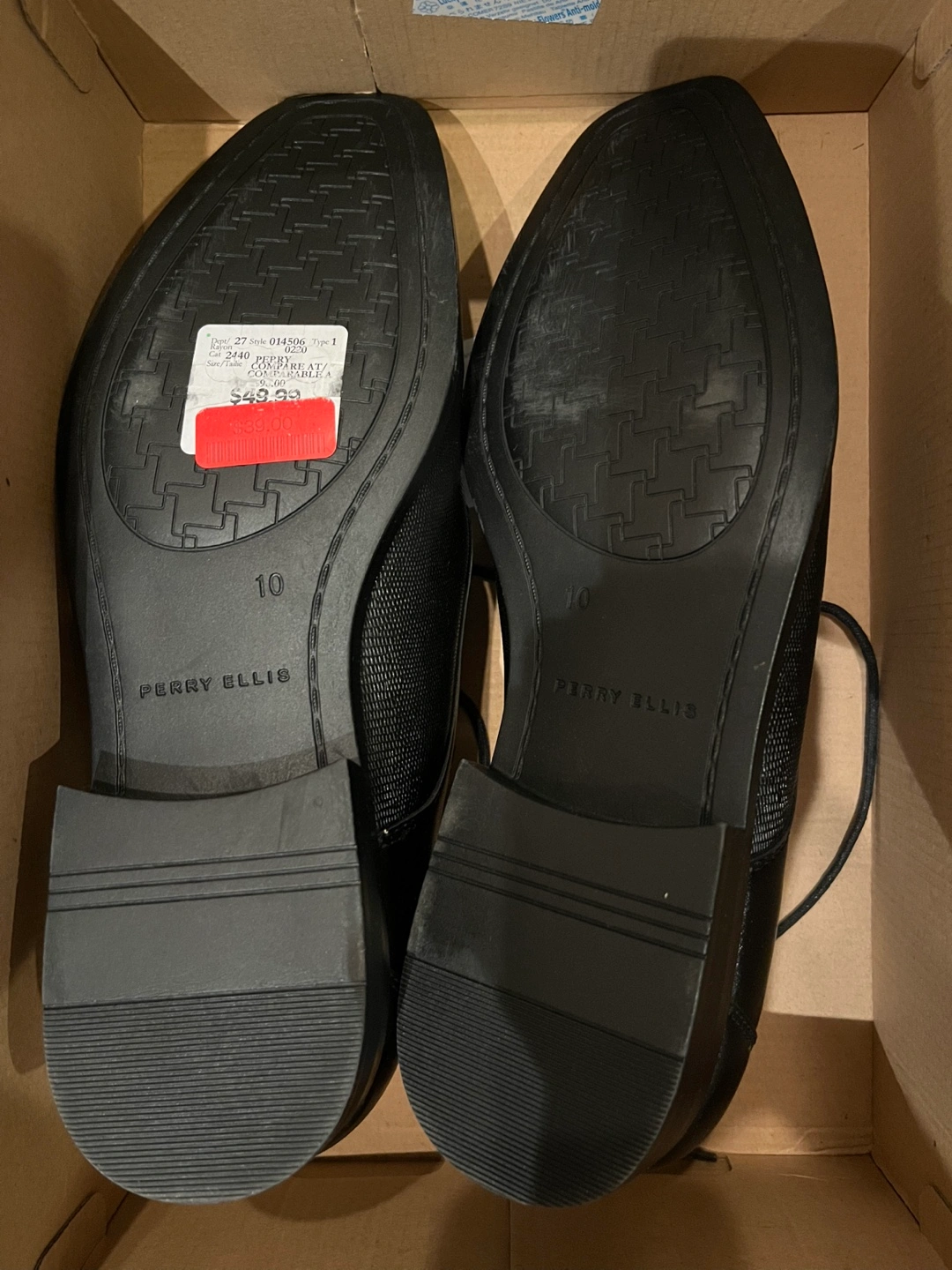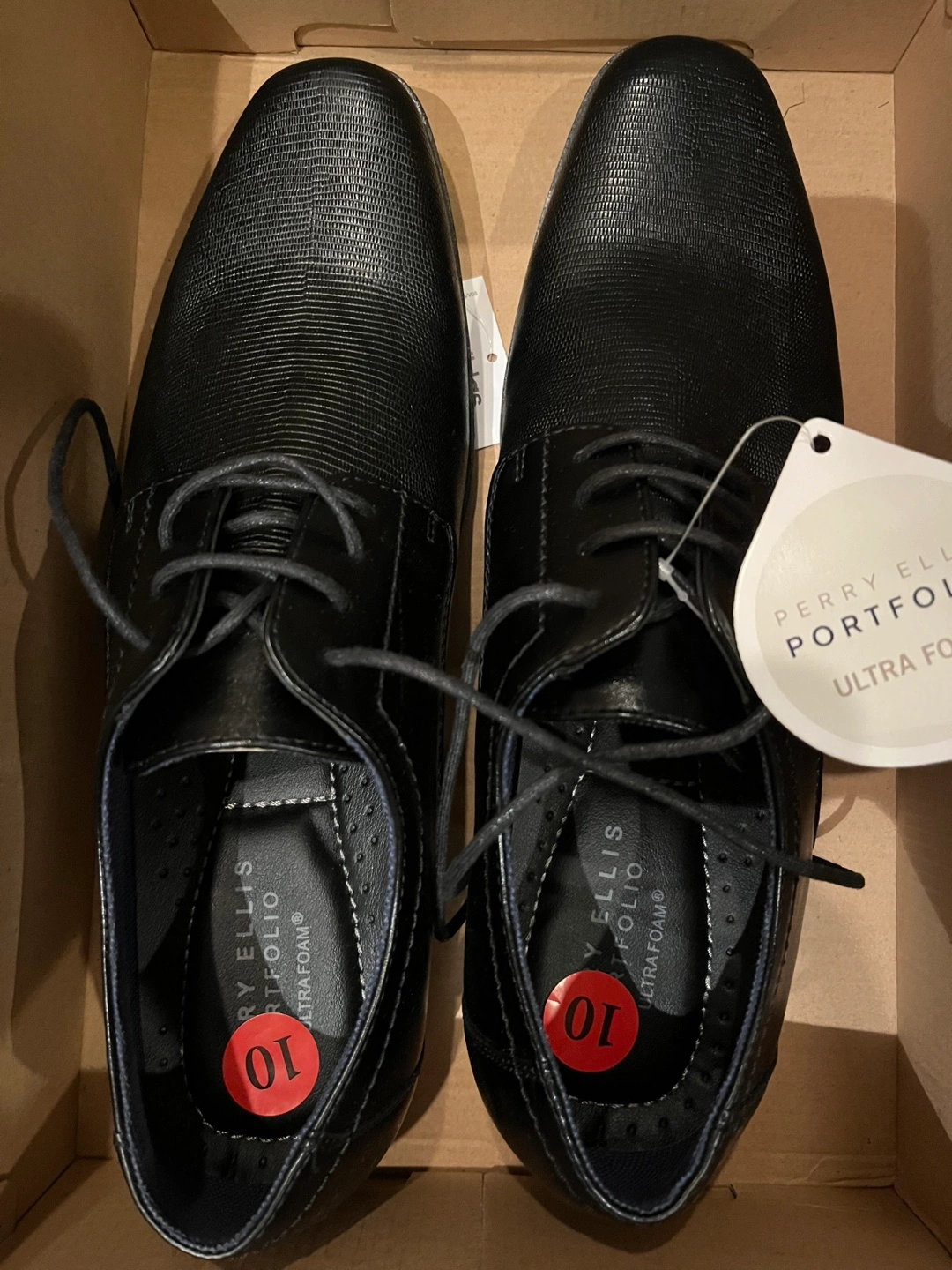 192New Perry Ellis Portfolio men's dress shoes. Size 10. Black leather. Ultrafoam insole. Lace-up style. Boxed.