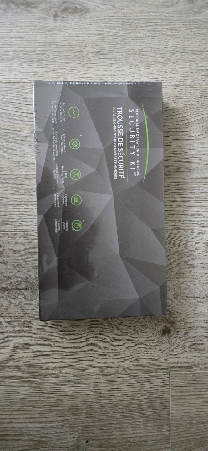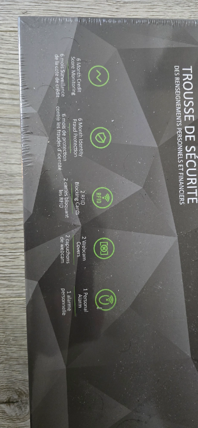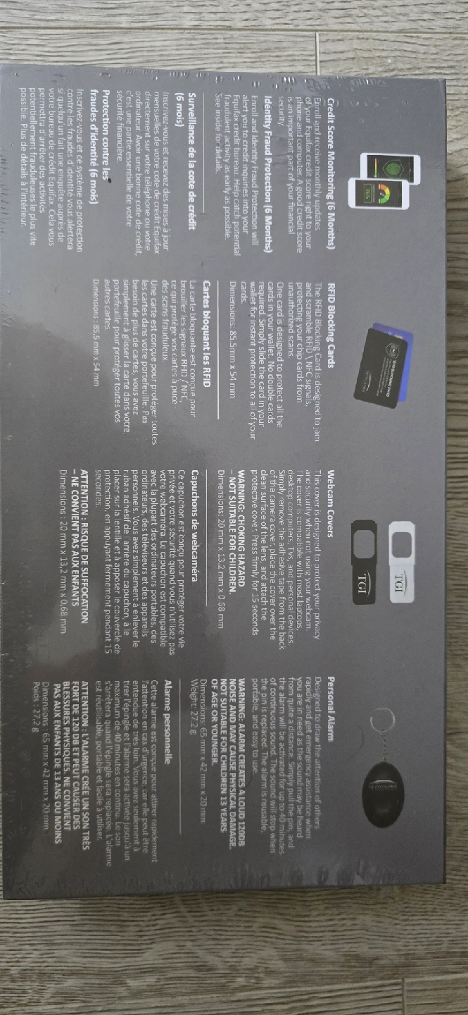 139Selling a personal information and financial security kit. It includes: - 6 months of credit score monitoring - 6 months of identity fraud protection - 2 RFID blocking cards - 2 webcam covers - 1 personal alarm