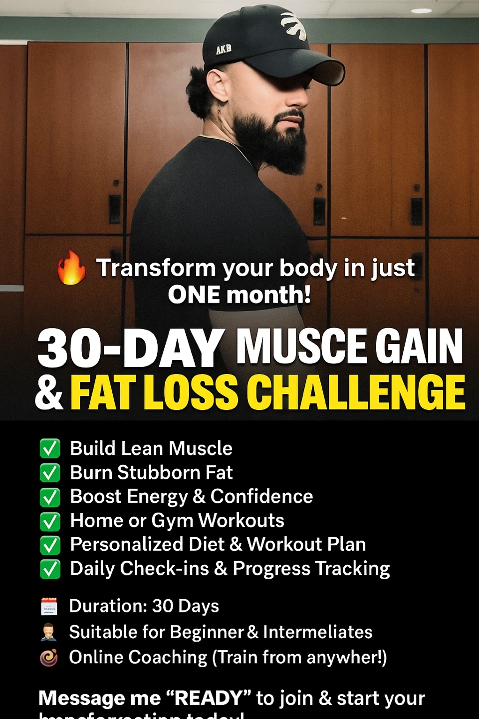 15𧨠30-DAY FAT LOSS CHALLENGE 𧨠π₯ Transform your body and confidence in just ONE month! π₯ β Burn Stubborn Belly Fat β Build a Leaner, Stronger Physique β Boost Energy & Confidence β Home or Gym Workouts β Personalized Meal & Workout Plans β Daily Check-ins & Progress Tracking π Duration: 30 Days π€ Perfect for Beginners & Intermediates π Online Coaching β Train from Anywhere! β Coach Ammy Certified Fitness Trainer ποΈββοΈ Helping real people get real results πͺ