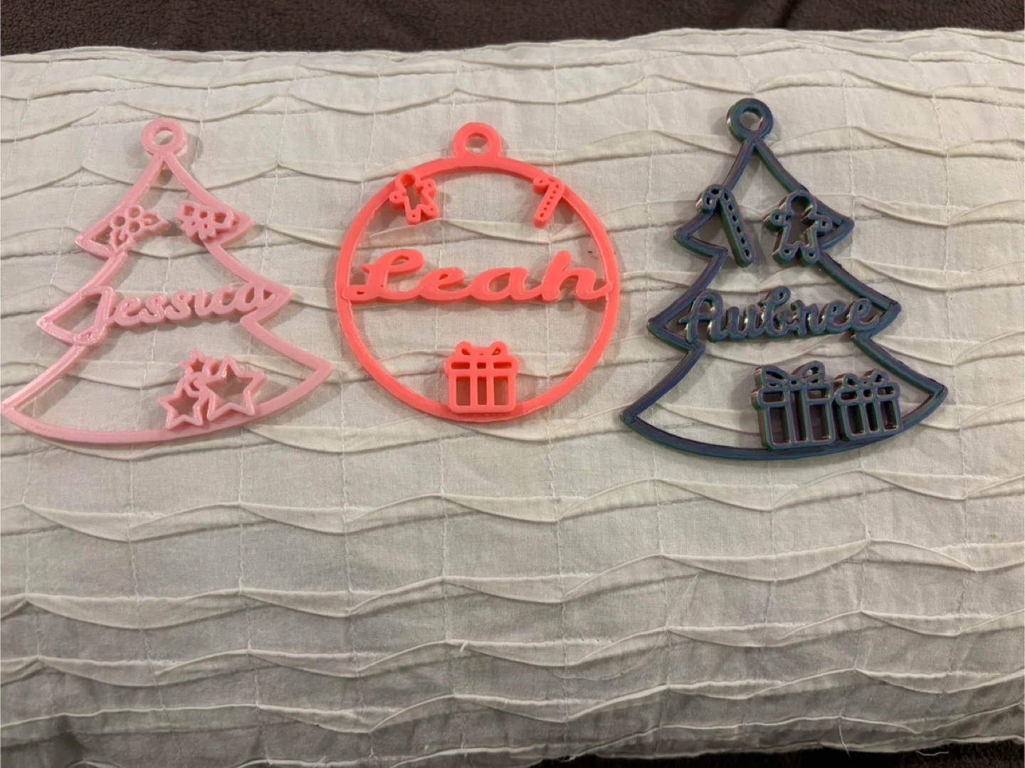 67I'm selling personalized Christmas tree ornaments! They come in a variety of colors and designs, perfect for adding a personal touch to your holiday decorations. Let me know what you’re looking for. Prices vary. Pick up in Whitby Custom ornament hooks as well. Check out photos for details