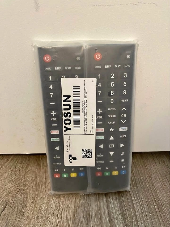 This is a pack of two universal replacement remotes for Samsung TVs, still in original packaging. They have direct access buttons for Netflix, Hulu, and Prime Video and work with Samsung Smart LCD LED Curved Frame Solar HDTV 3D TVs.