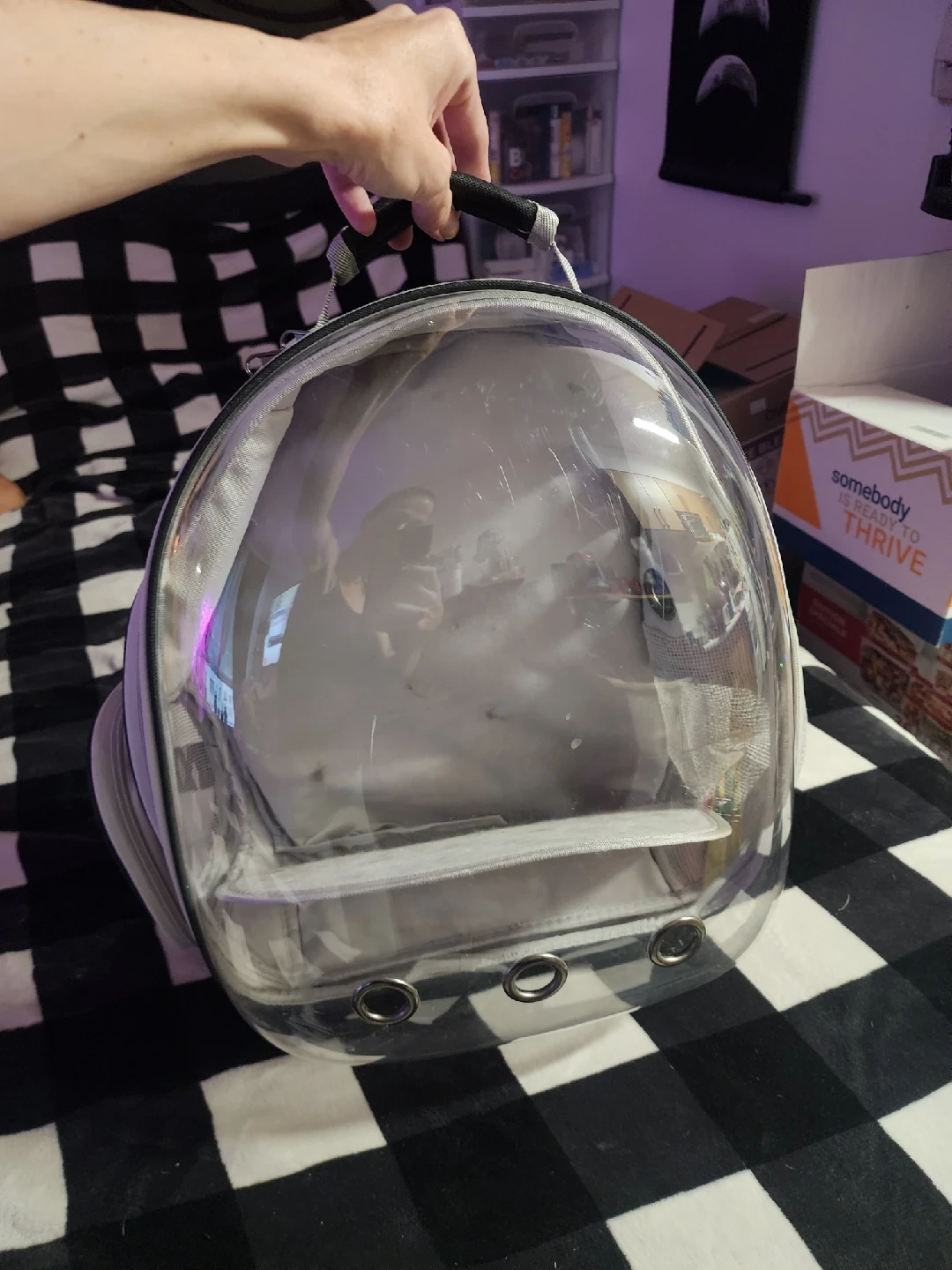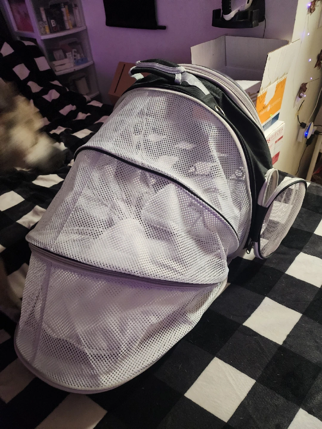23Selling a pet carrier backpack in black and white! It's in great condition and perfect for taking your furry friend on adventures. It has a mesh front for ventilation and a clear dome for visibility. also has an extra area for when you stop for pet to stretch out. Your pet will love it! I have also seen these used for birds. This was only used twice for about an hour each time
