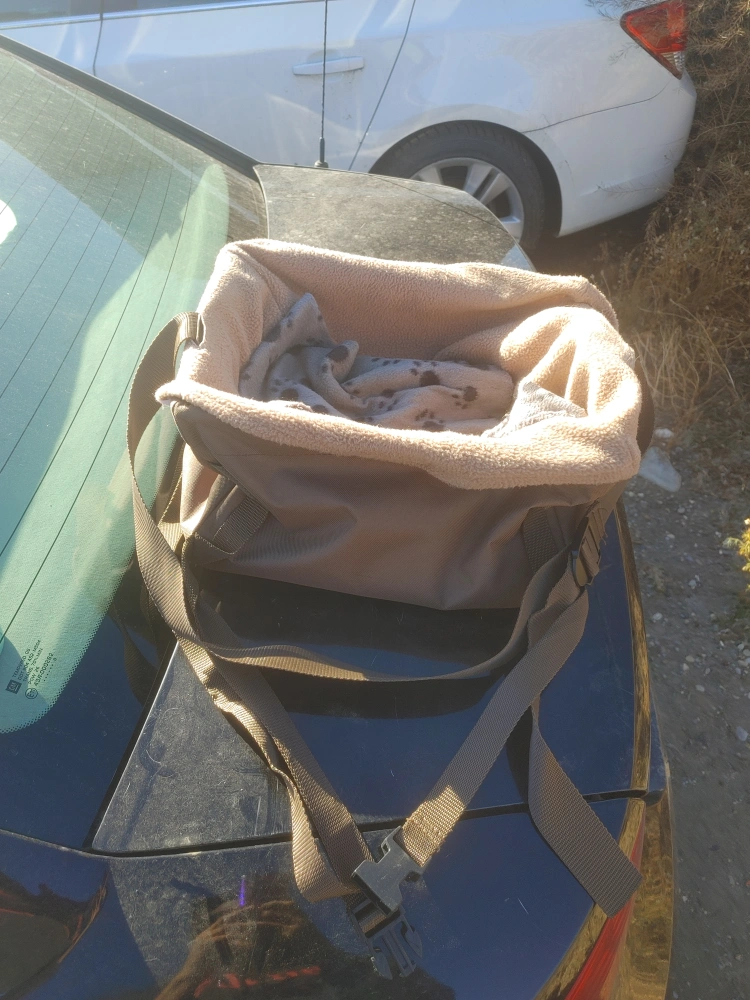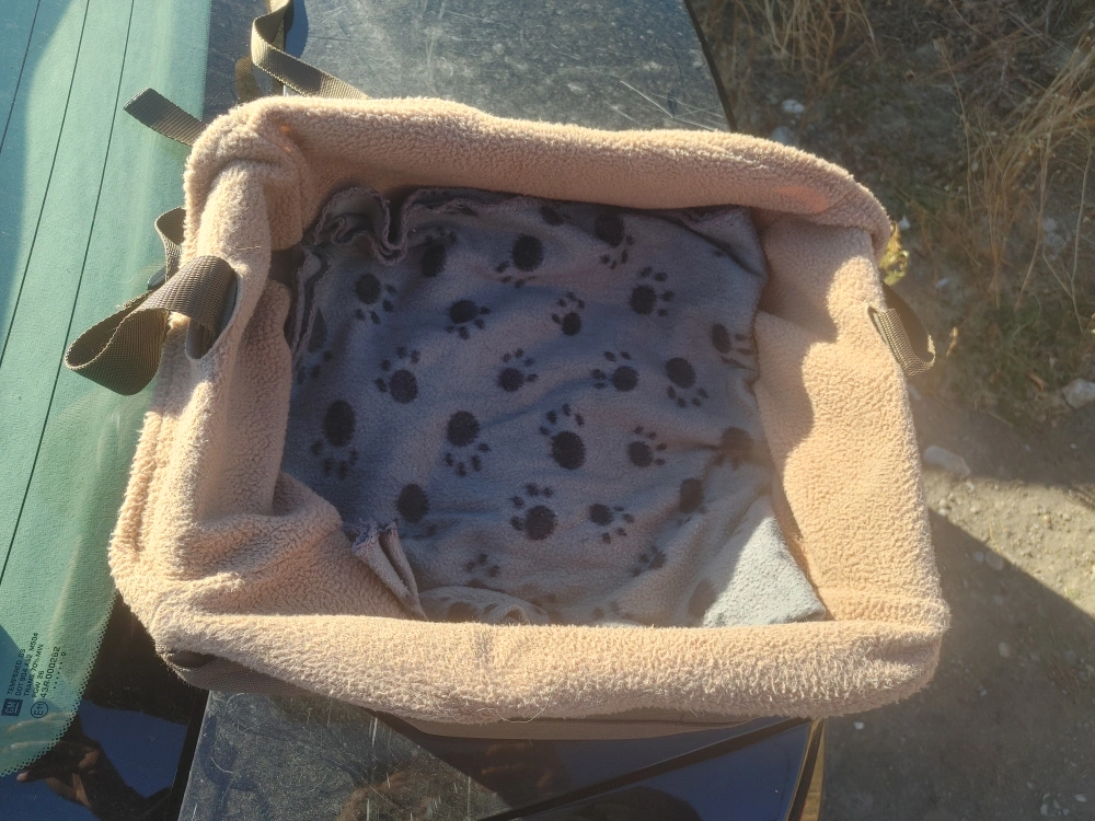 65Pet carrier bag in good condition! It's a soft-sided carrier with a plush interior featuring a paw print design. Perfect for small dogs or cats, making trips to the vet or travel more comfortable for your furry friend