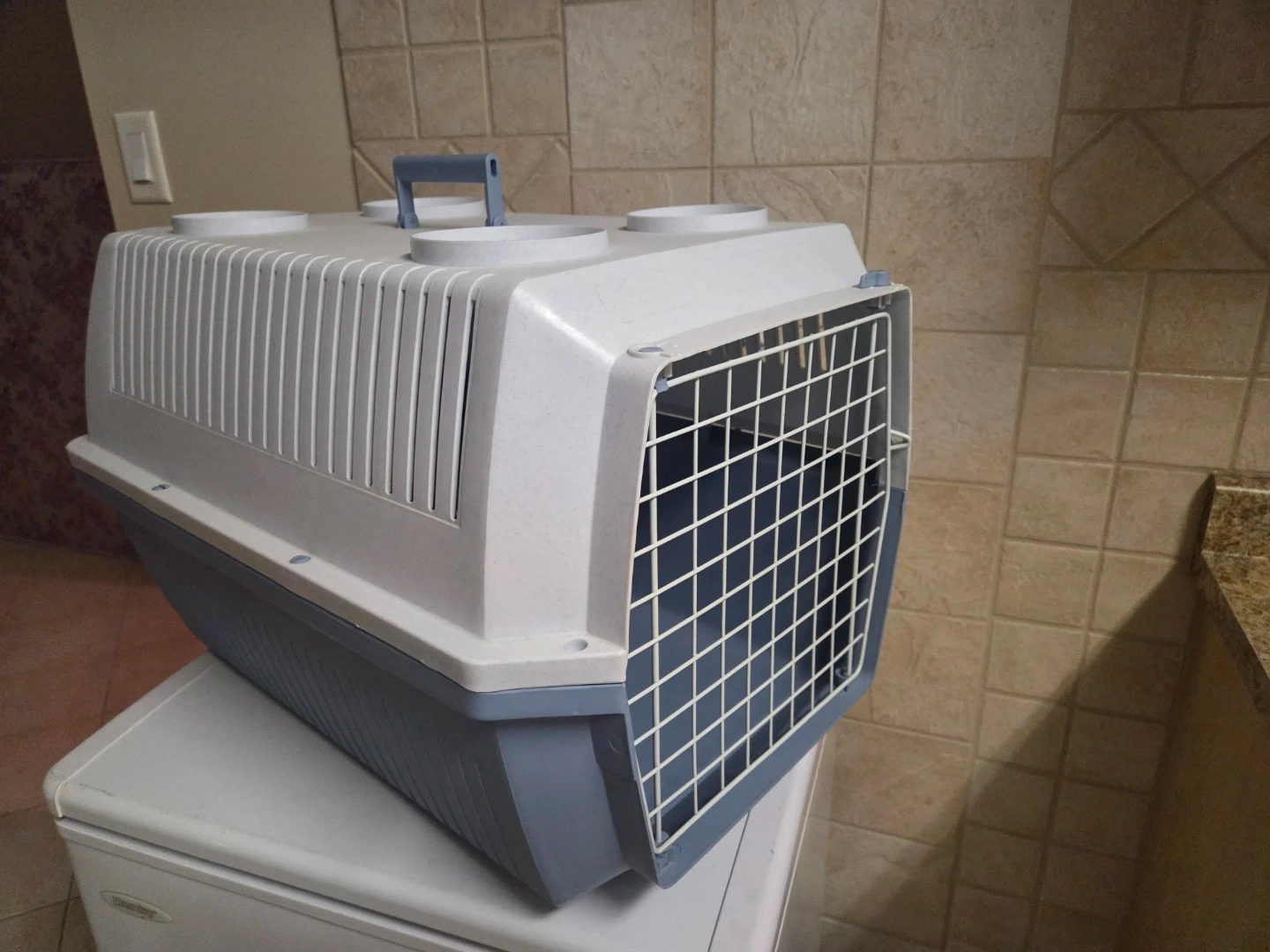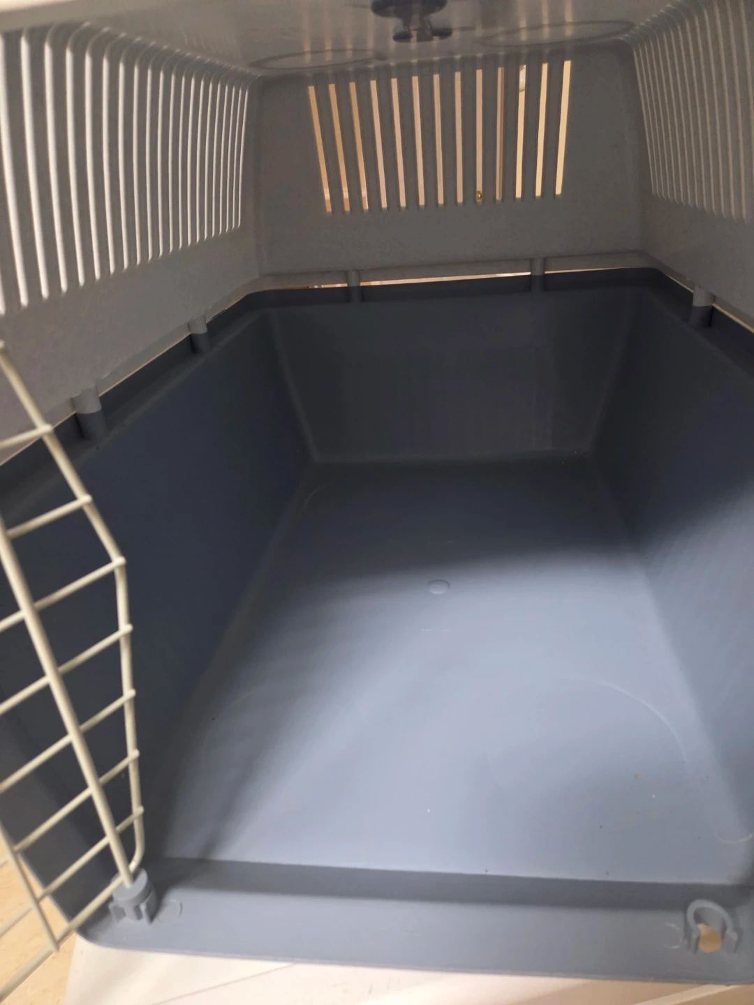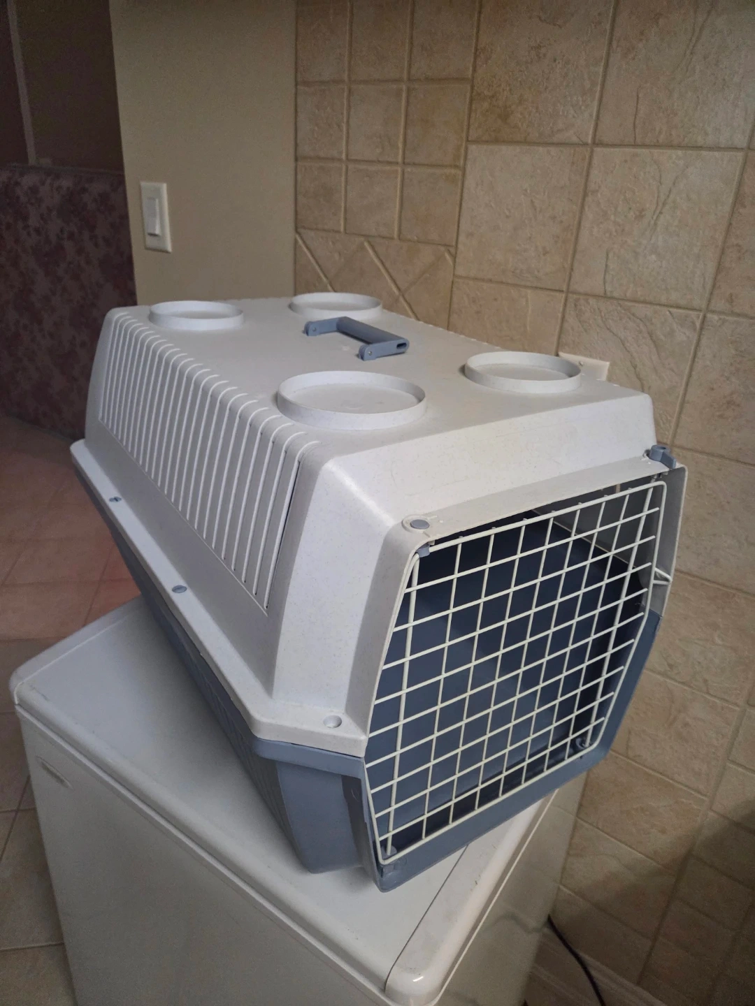 87Selling a pet carrier in good condition! It's a mix of blue and white, perfect for taking your furry friend on trips to the vet or on vacation. The carrier has a metal gate and ventilation holes for comfort and safety