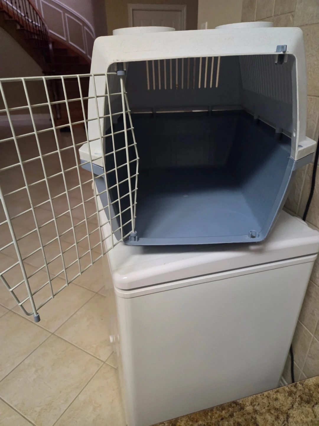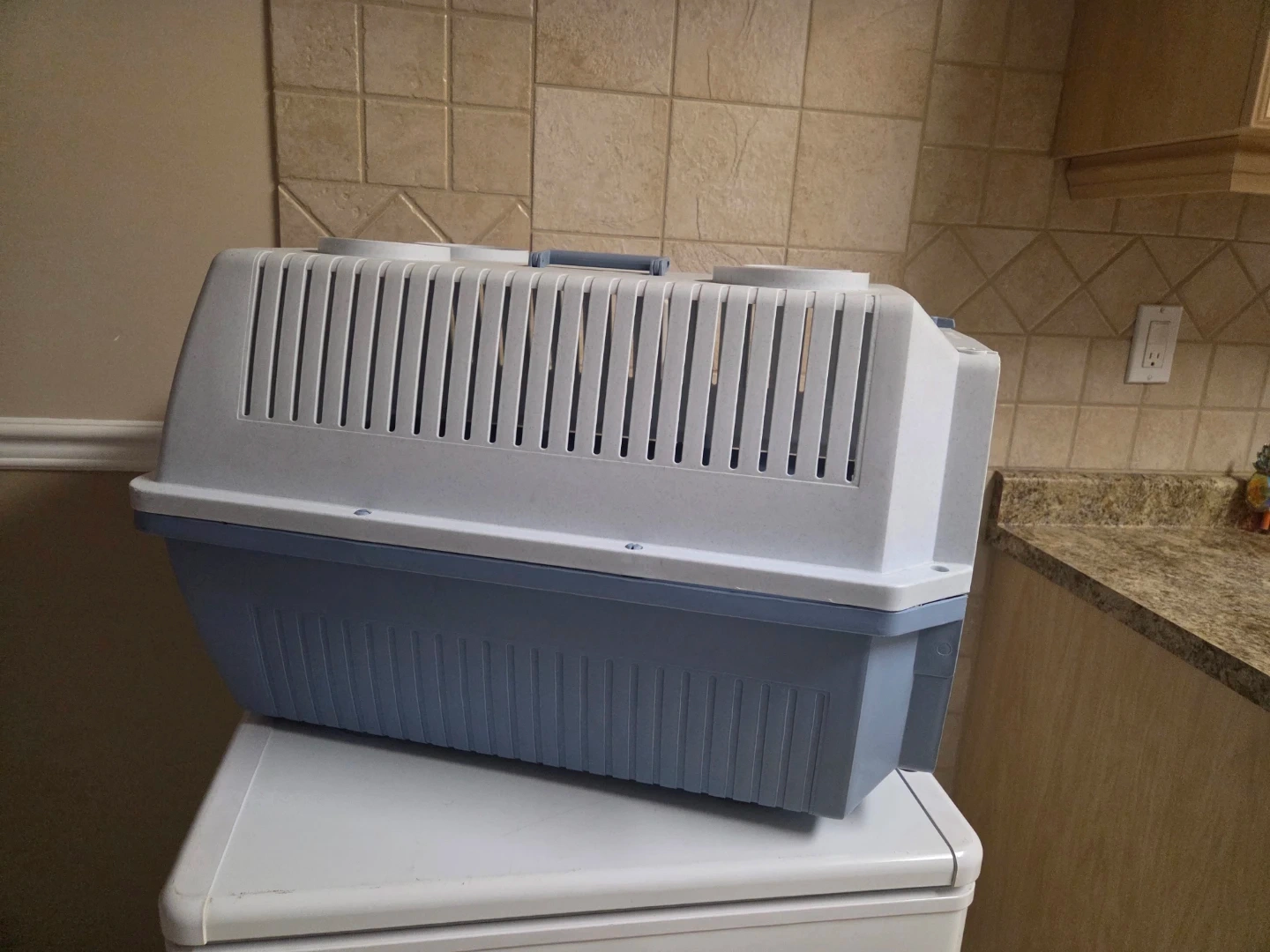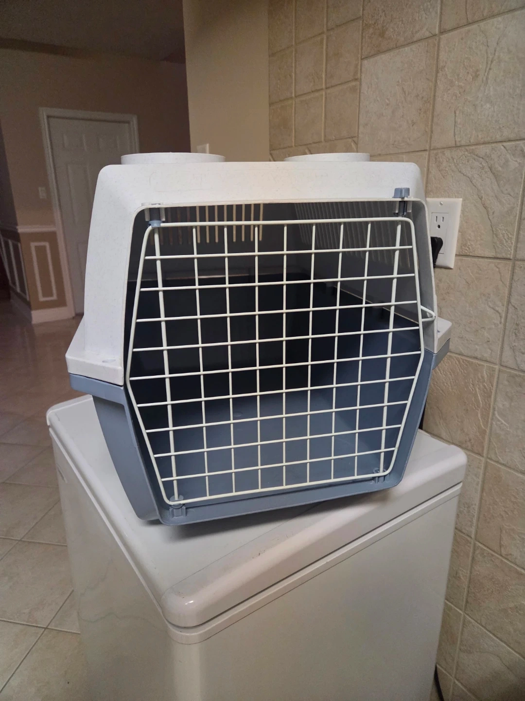 87Selling a pet carrier in good condition! It's a mix of blue and white, perfect for taking your furry friend on trips to the vet or on vacation. The carrier has a metal gate and ventilation holes for comfort and safety