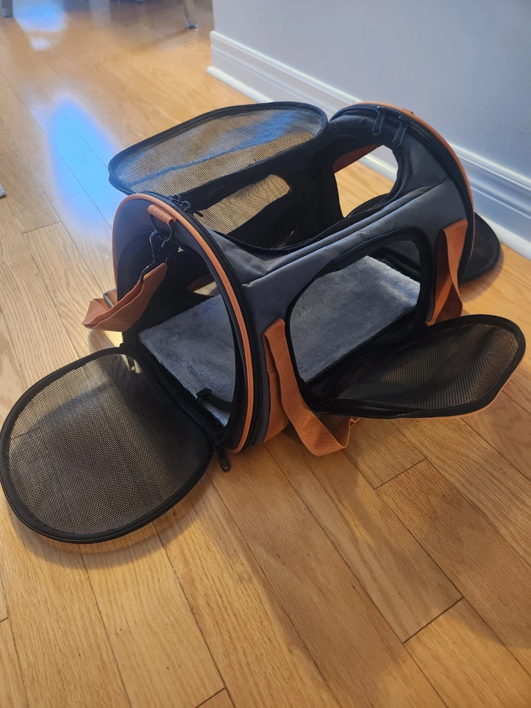 5Selling a pet carrier in great condition! It's grey and orange, with mesh windows for ventilation. Perfect for taking your furry friend on trips or to the vet. It has a soft, padded bottom for their comfort. The base size is 42 cm x 25 cm