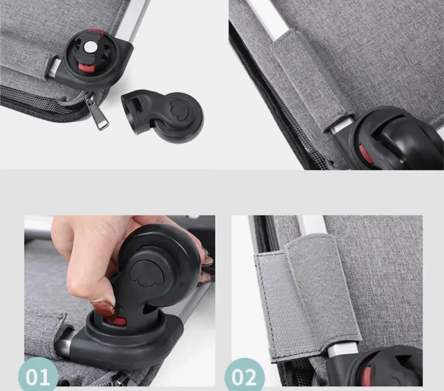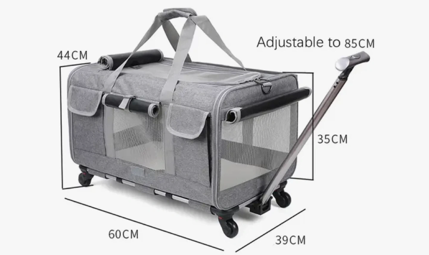Selling a grey pet carrier with wheels! It's in great shape and ready for your furry friend. The dimensions are approximately 44cm x 60cm x 35cm, adjustable up to 85cm in height. It's designed for easy transport and convenience Only brought it out once.