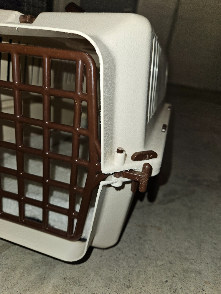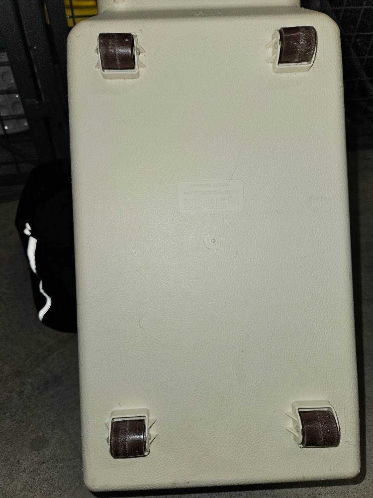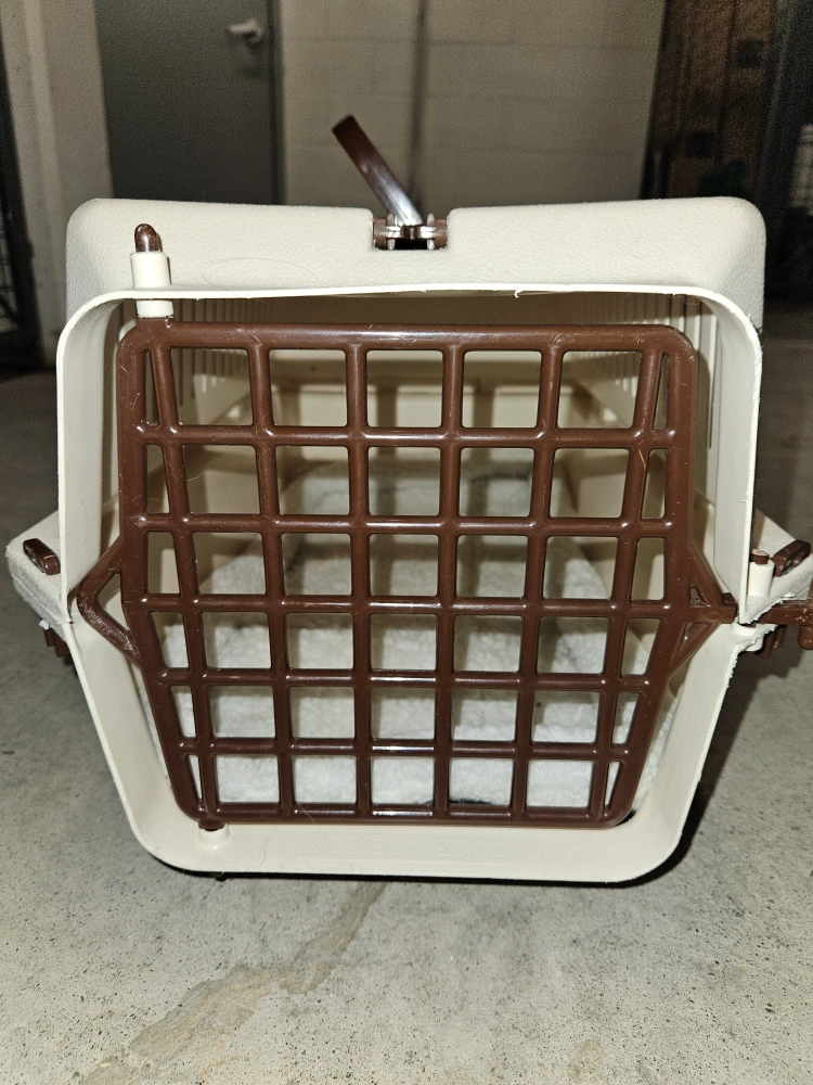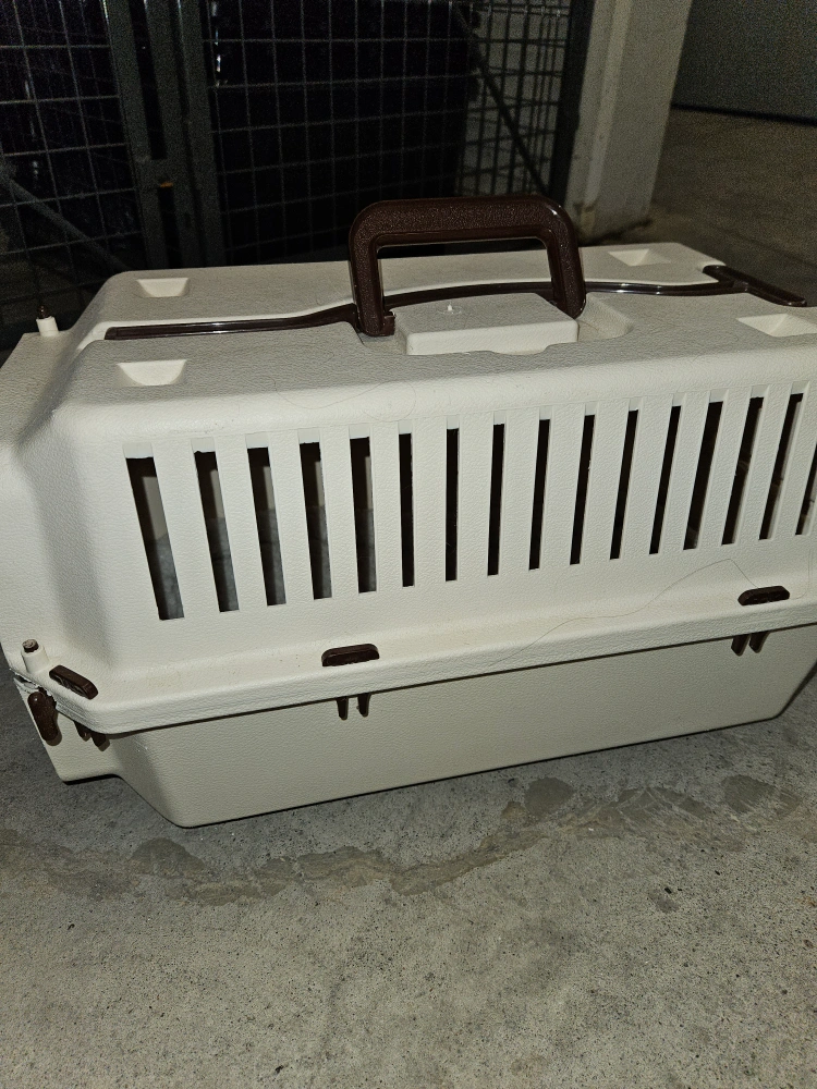 159Used pet carrier. Beige plastic with brown accents. Features a carrying handle and four small wheels. Suitable for small to medium-sized pets.