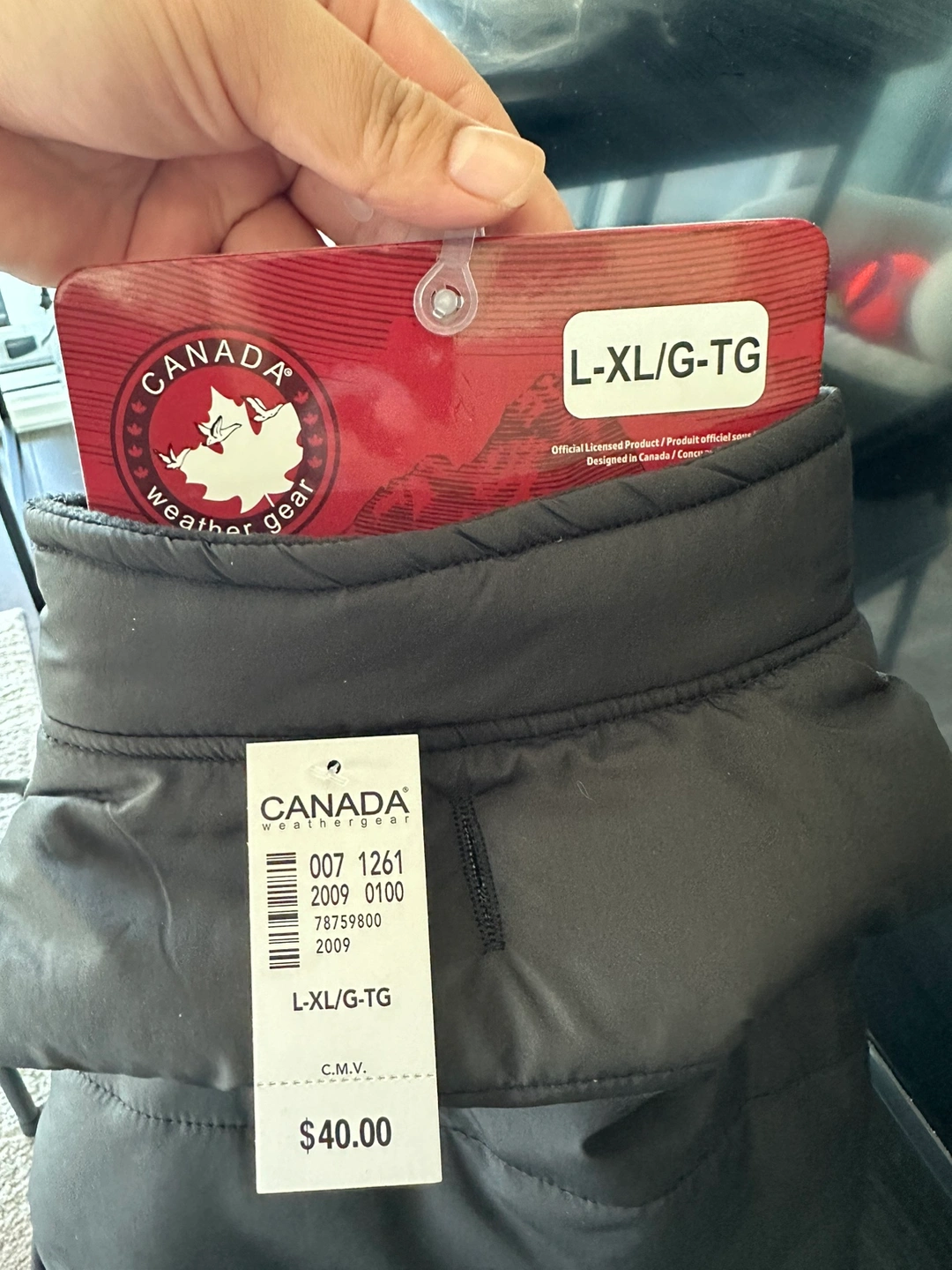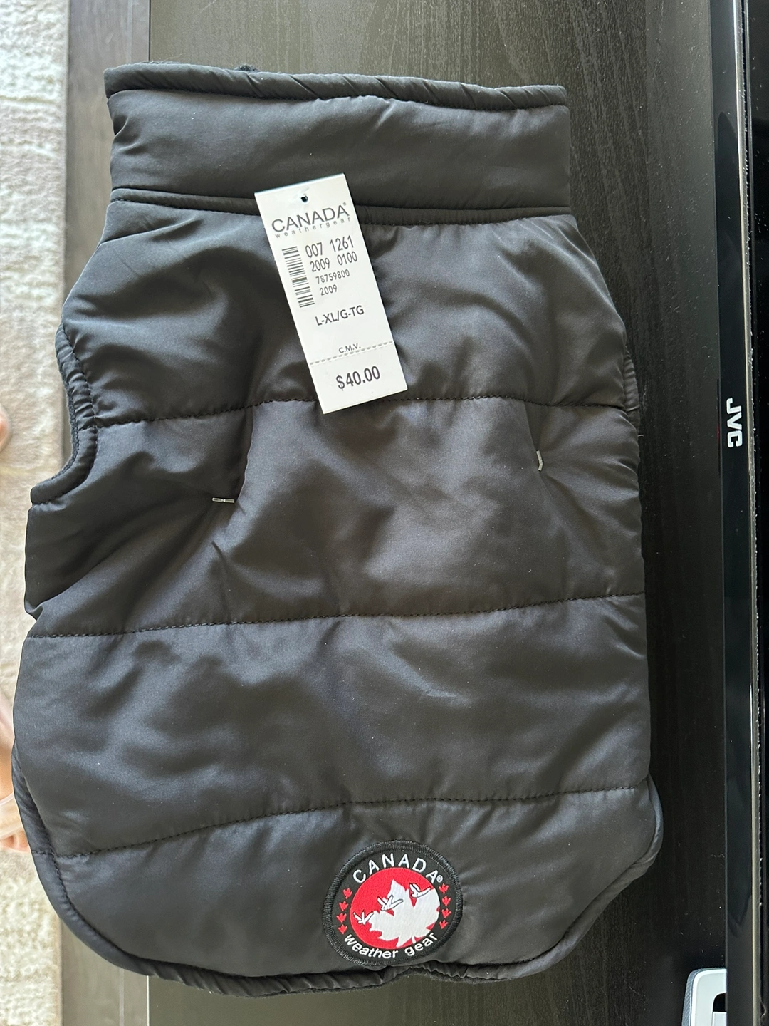 219Black puffer vest with "Canada Weather Gear" branding on the front and back. It says Size L-X• but honestly it’s Small, could fit a medium thin dog. Totally new, still has the tags. I have it in Brentwood Concord but I could deliver in commercial broadway skytrain station or in front of pacific centre mall