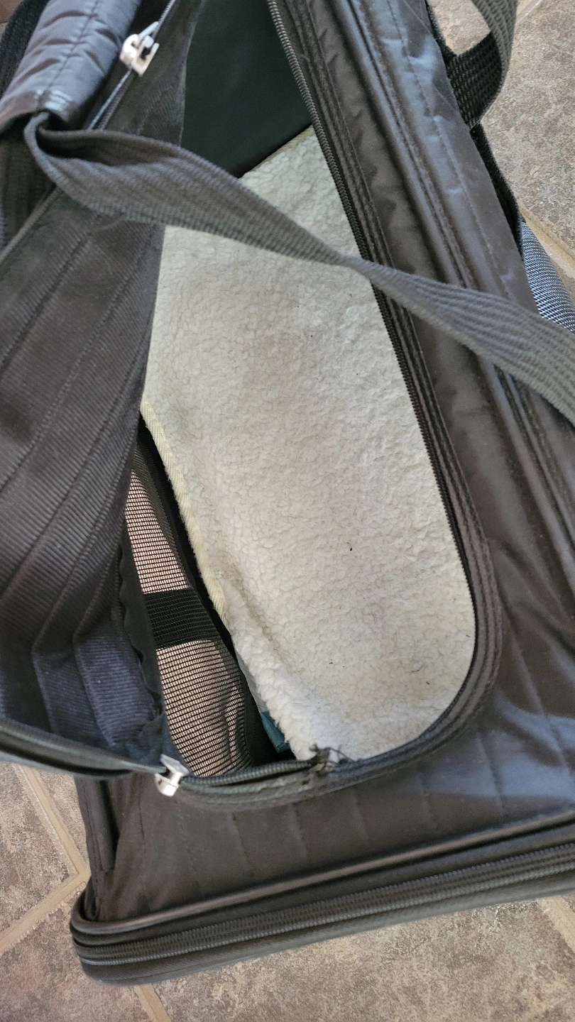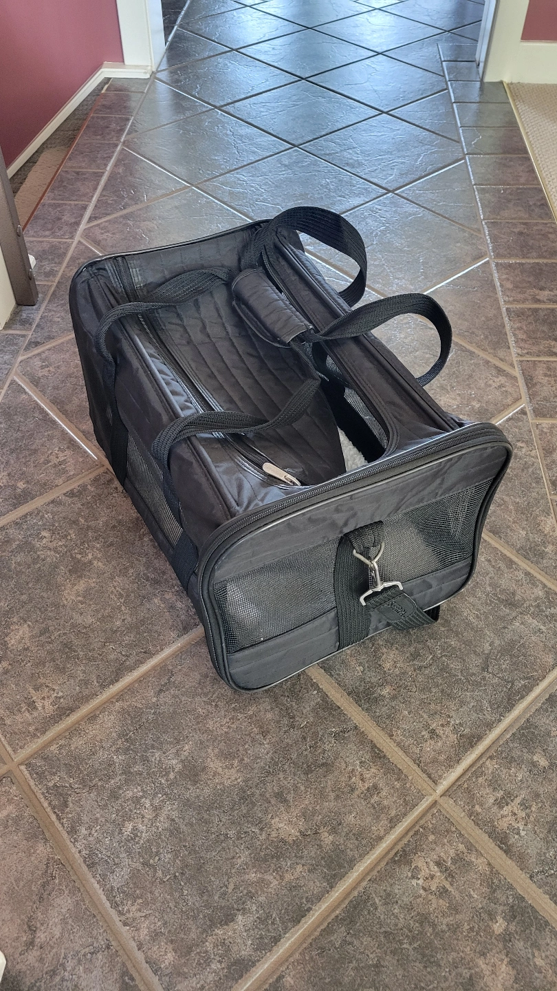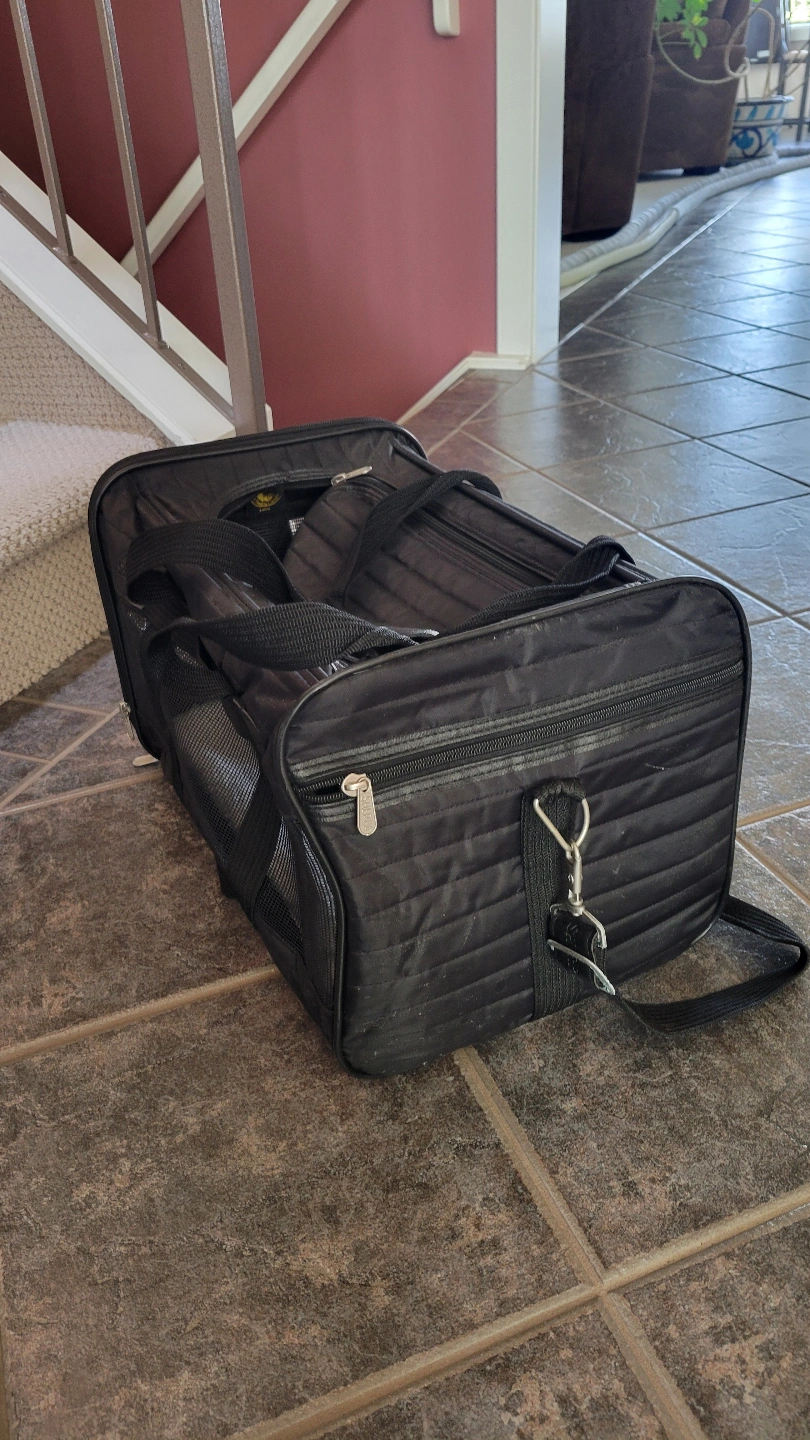 28Black pet carrier. Soft-sided carrier with mesh sides. Includes a soft fleece liner. Great for small dogs, puppies, or cats. Please note, the zipper zips but cannot be brought to the end as it's somewhat broken, hence it being free.