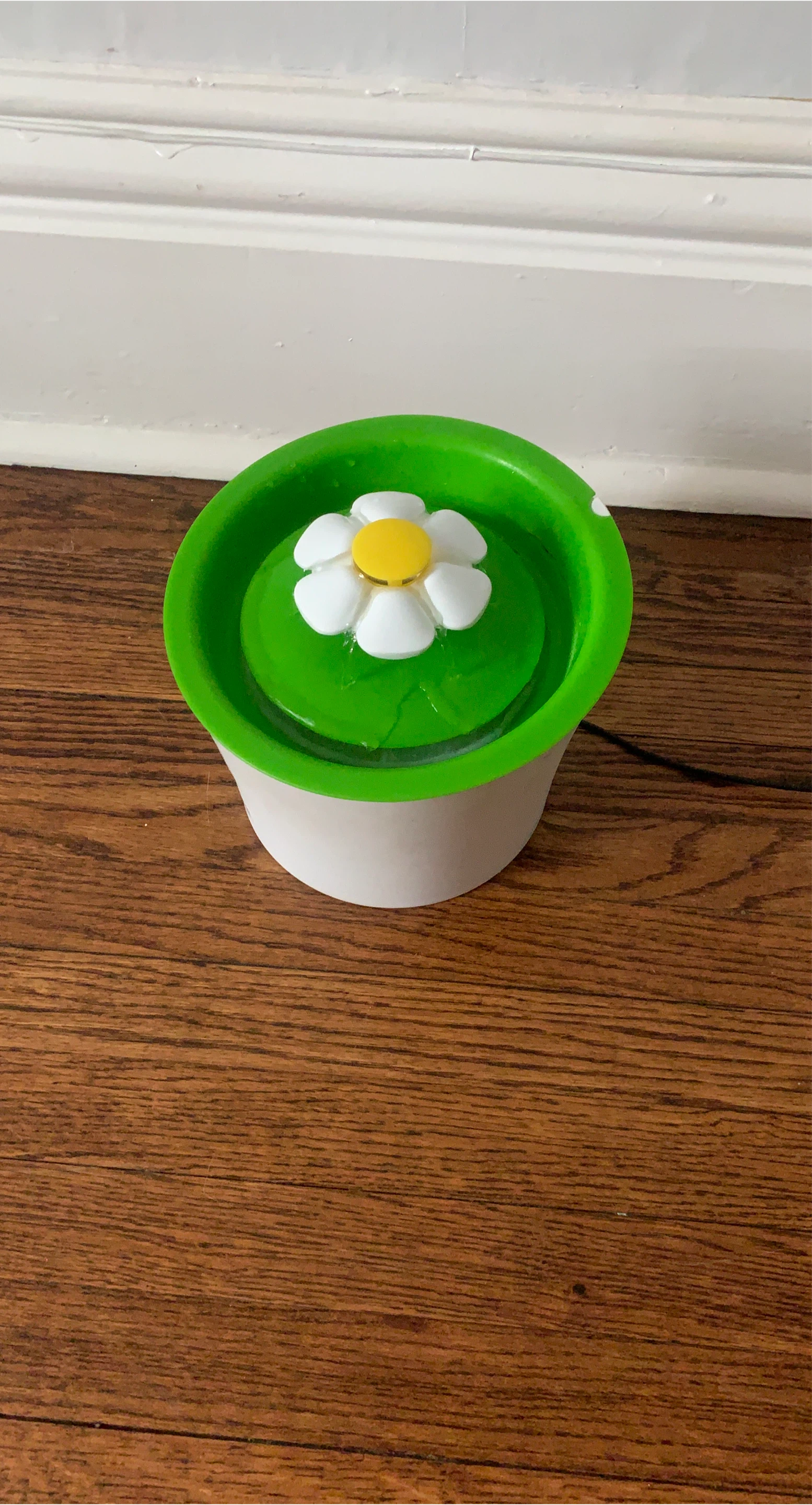 138I'm selling a pet water fountain with a cute flower design on top. It's in great condition and ready to keep your furry friend hydrated! The fountain is green and white. It's a great way to encourage your pet to drink more water