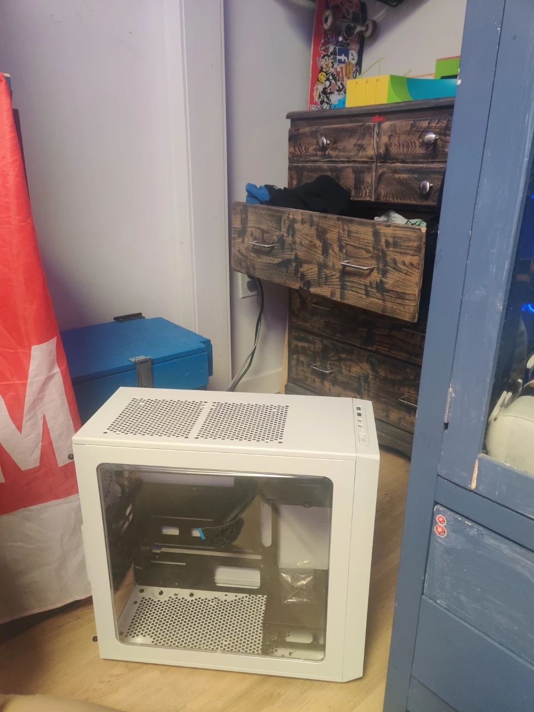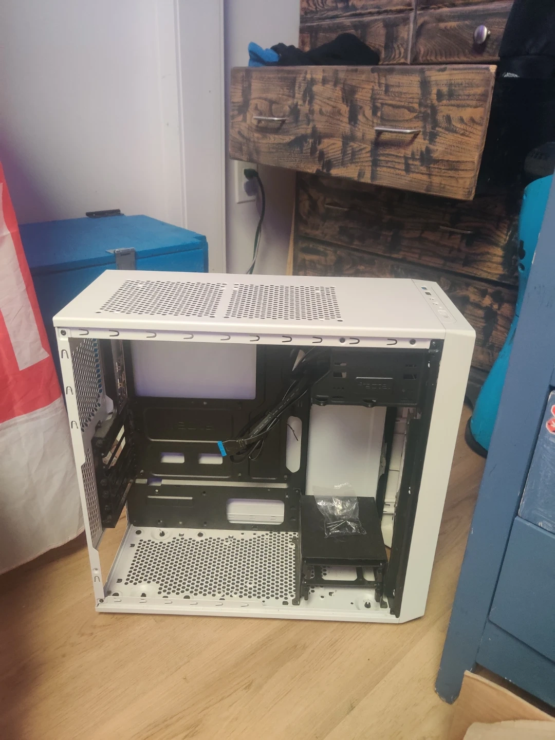 This is a white mid-tower PC case. It's suitable for building a custom desktop computer. The case has good ventilation with its mesh front panel.