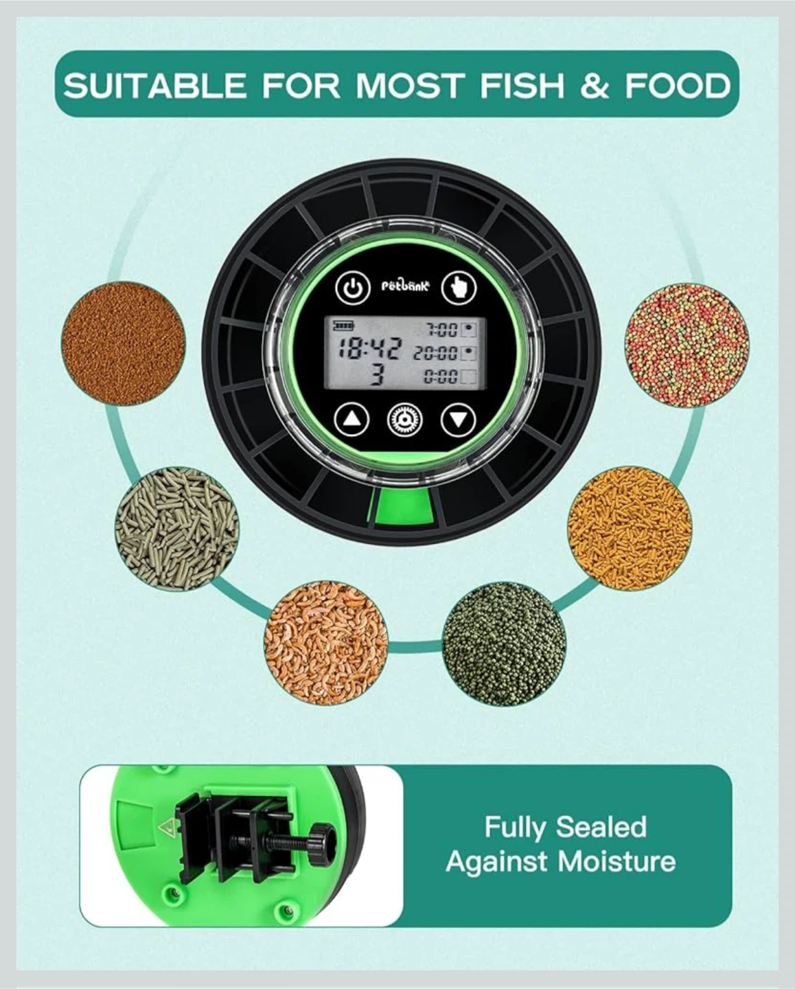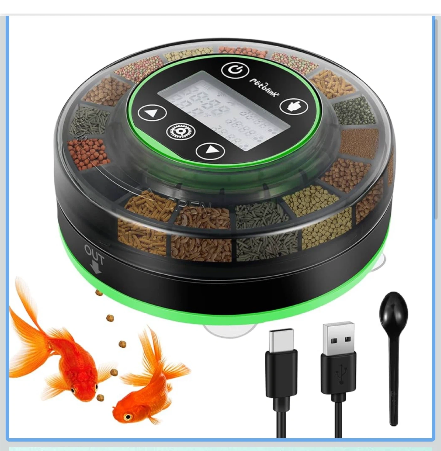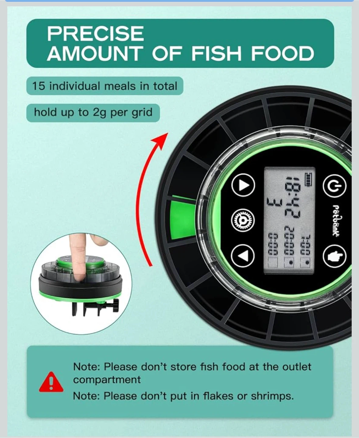 I'm selling a Petbank automatic fish feeder! It's suitable for most fish and food, and it's fully sealed against moisture. You can personalize the feeding time and it fits any aquarium with two installation options. It also allows for a precise amount of fish food, with 15 individual meals in total, holding up to 2g per grid