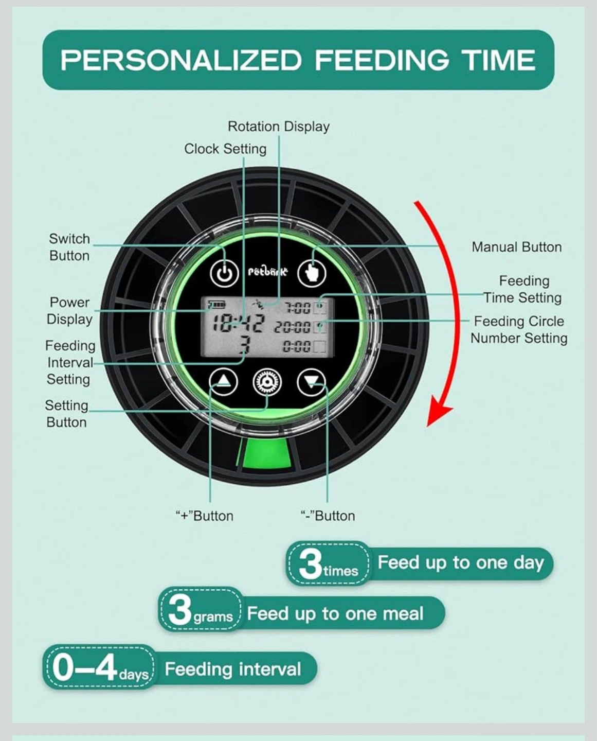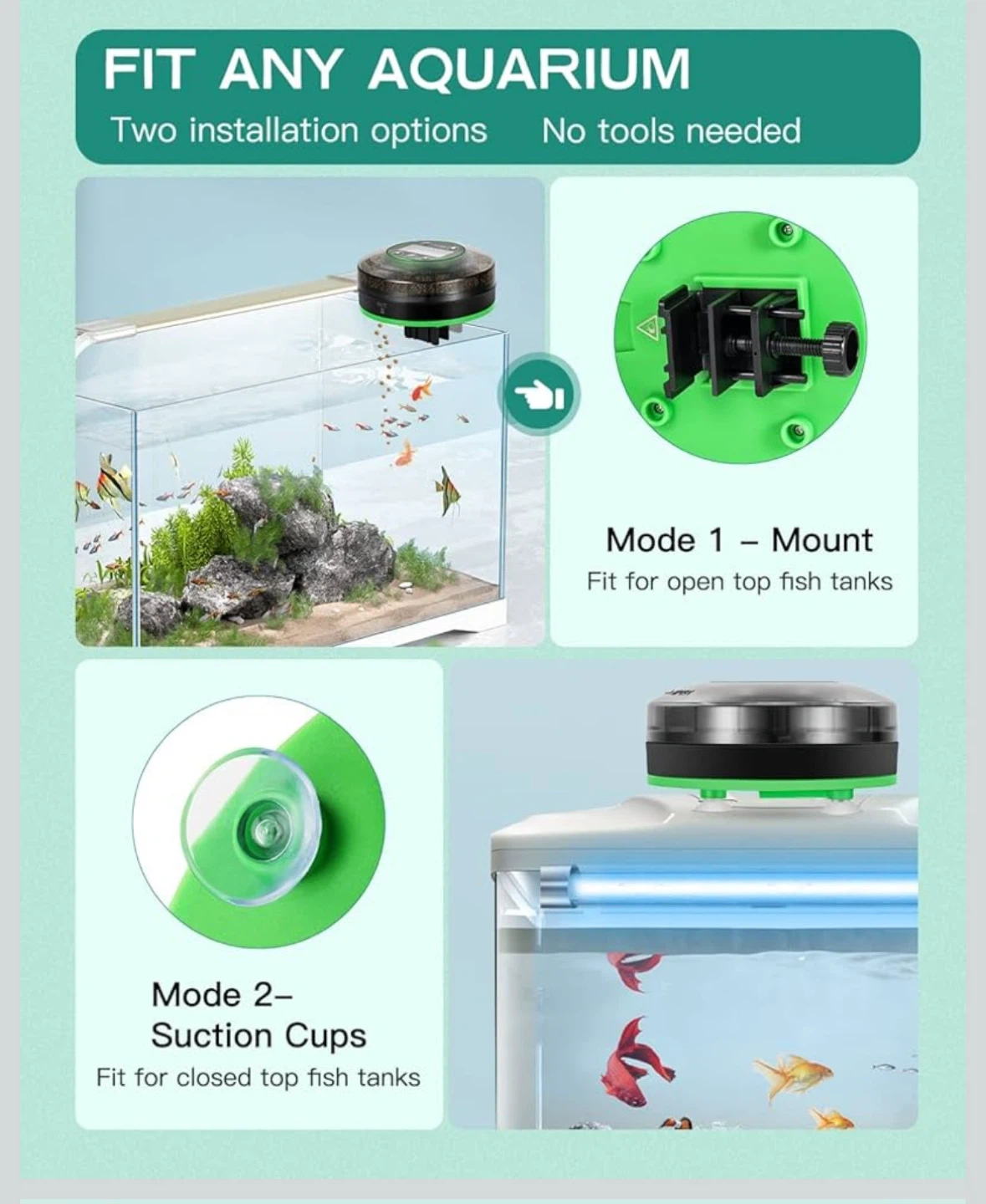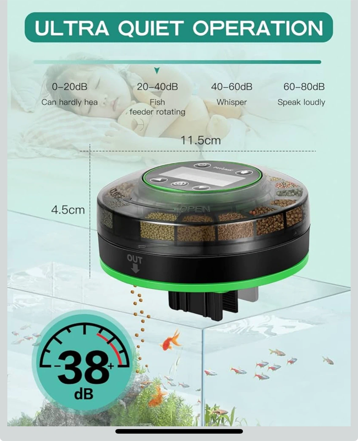I'm selling a Petbank automatic fish feeder! It's suitable for most fish and food, and it's fully sealed against moisture. You can personalize the feeding time and it fits any aquarium with two installation options. It also allows for a precise amount of fish food, with 15 individual meals in total, holding up to 2g per grid