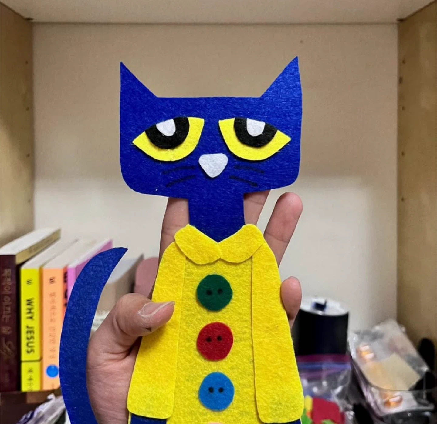10This is Pete the Cat — the main character of Pete the Cat Story! 🐱 In this story, Pete buys a brand-new pair of shoes and walks through strawberries, blueberries, mud, and water, splashing colors on his shoes along the way. It’s a story that kids really love! 💙 If you’d like, I can also send you the story script. Making felt stories is one of my favorite hobbies, so if there’s any felt story you need, feel free to ask! And if you’re interested in the Pete the Cat story, just let me know! 🩵