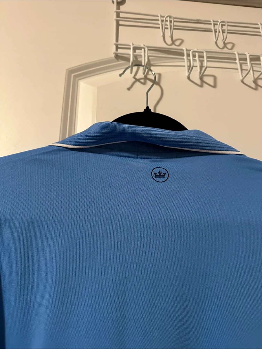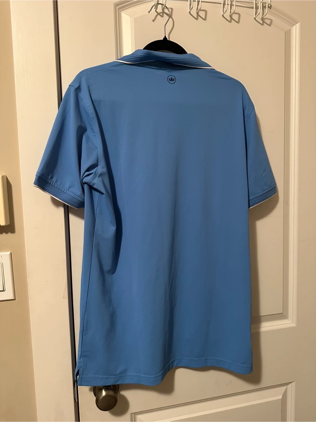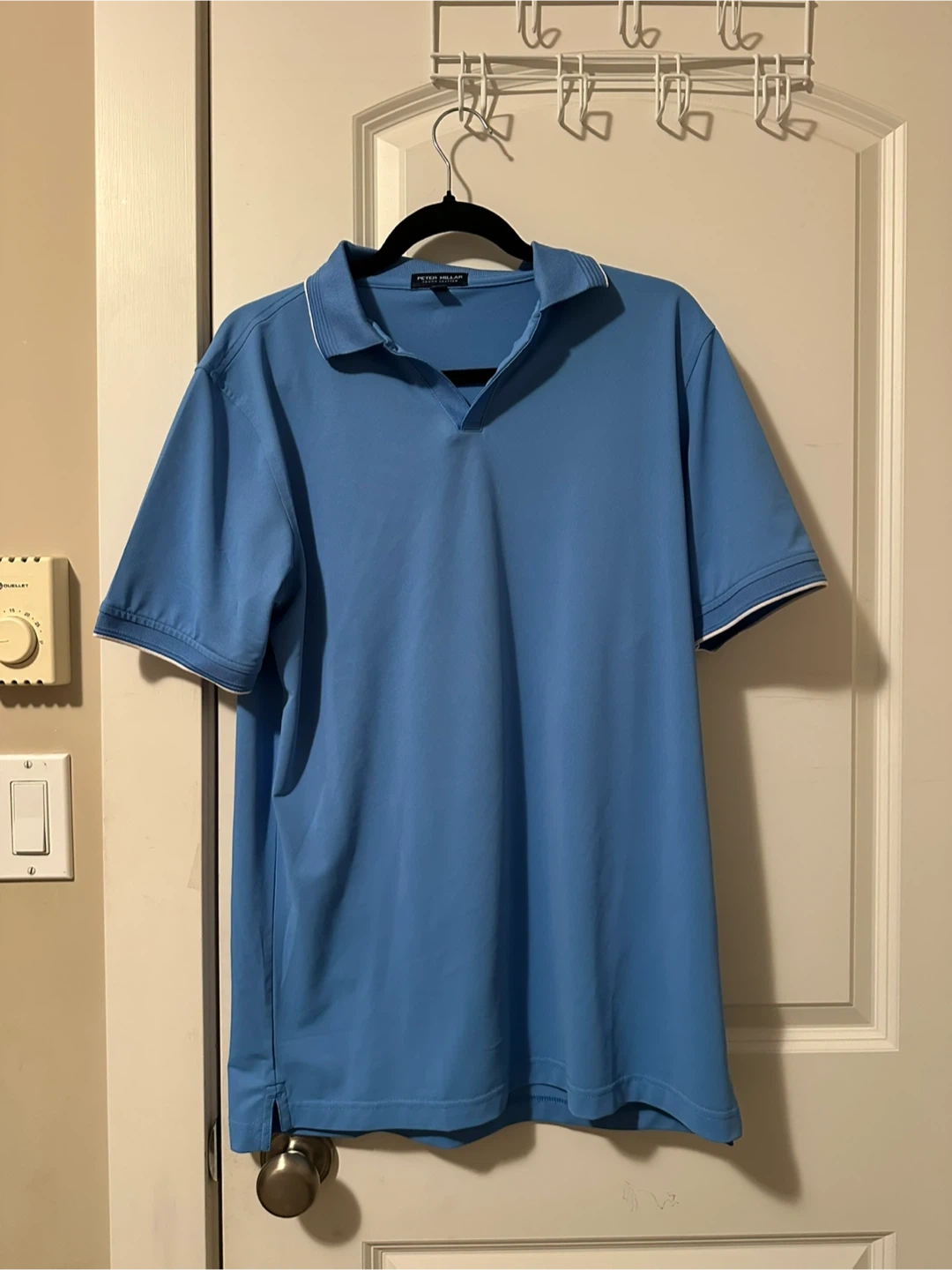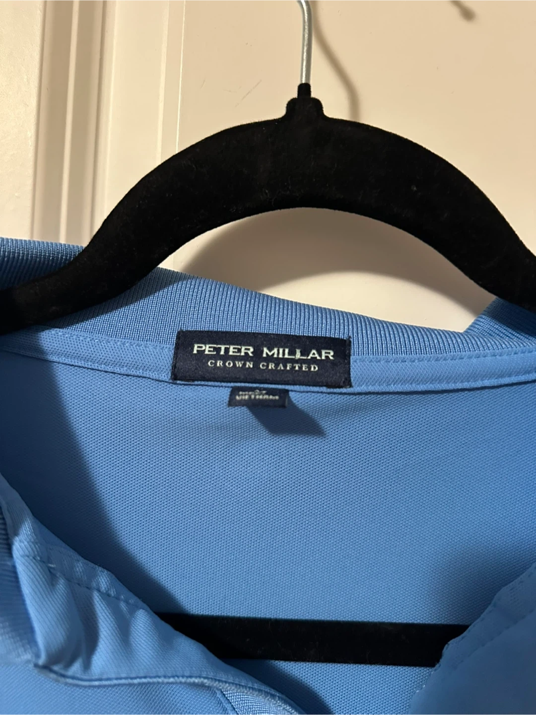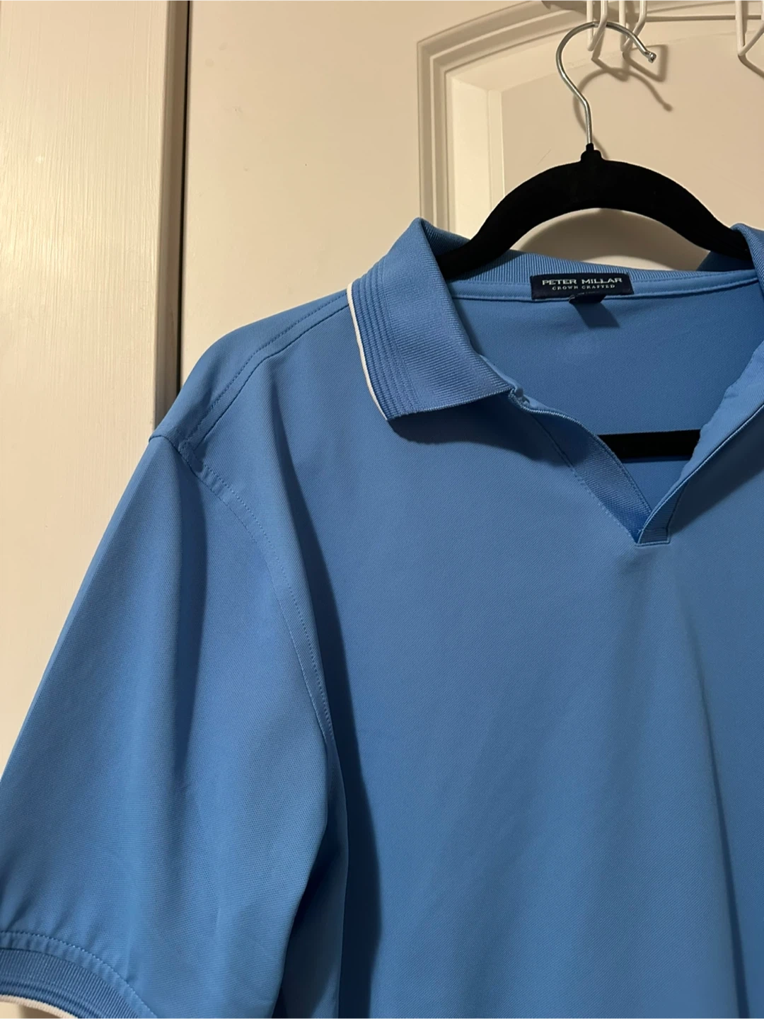 Looking to sell a gently used Peter Millar Crown Crafted polo shirt. It's a nice light blue colour and made of 94% polyester and 6% spandex, making it super comfy for everyday wear!