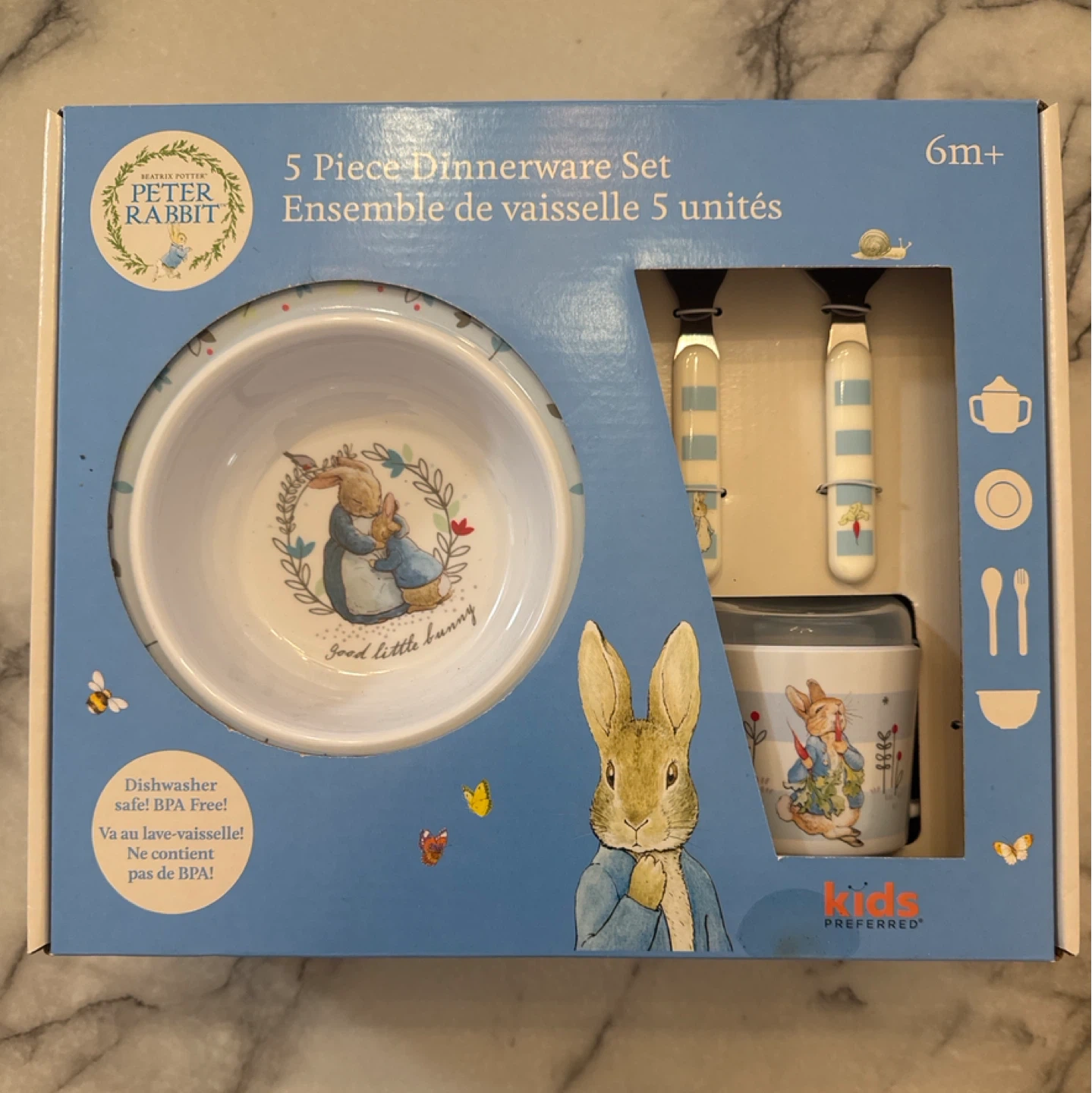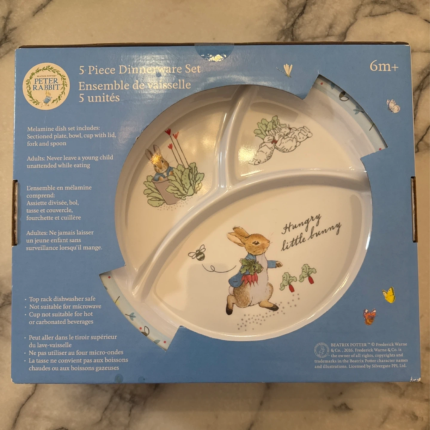 77Selling a super cute Peter Rabbit 5-piece dinnerware set! It's perfect for little ones aged 6 months and up. The set includes a sectioned plate, bowl, cup with lid, fork, and spoon. It's made of melamine, and the pieces are top-rack dishwasher safe and BPA free! Comes in the original box.